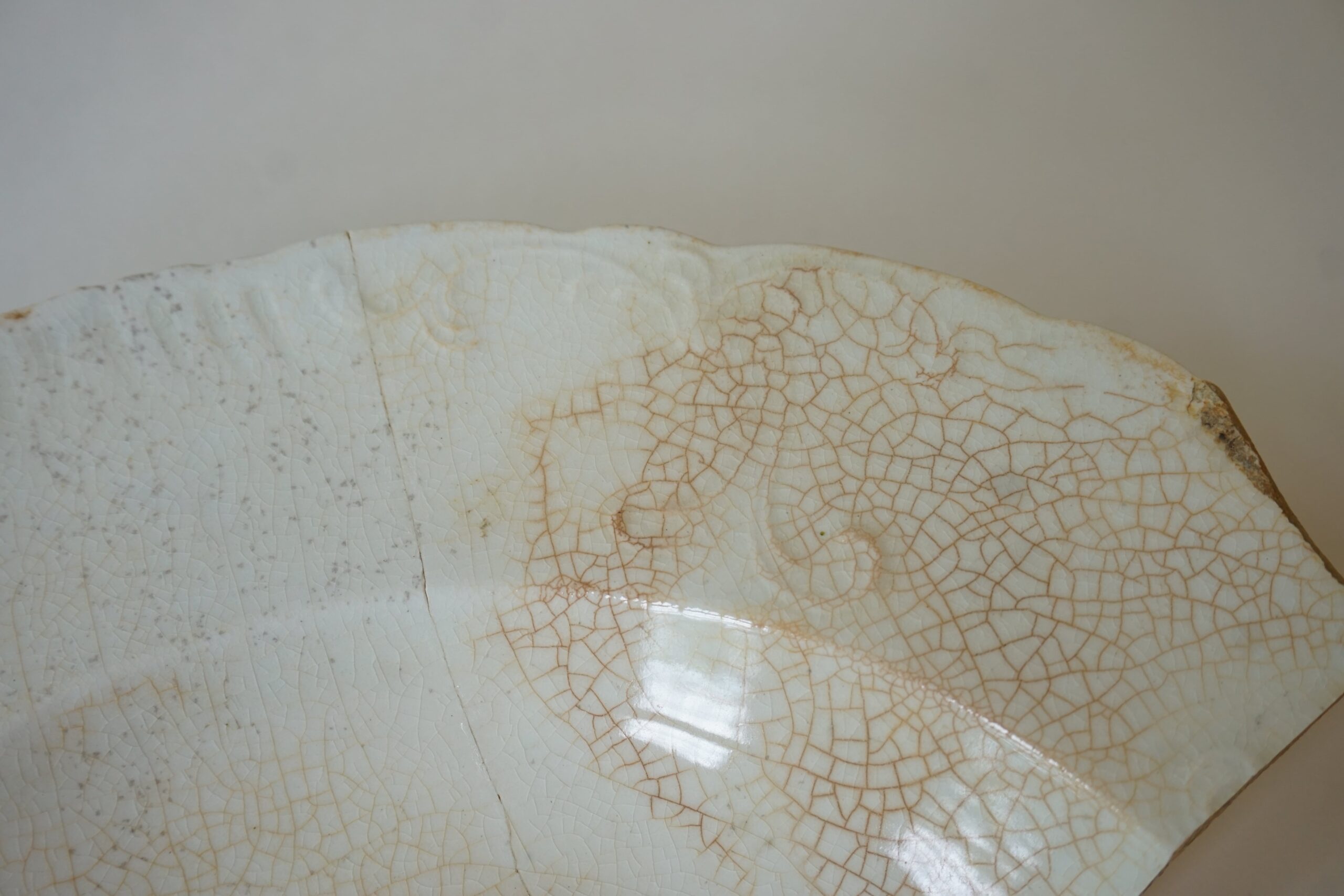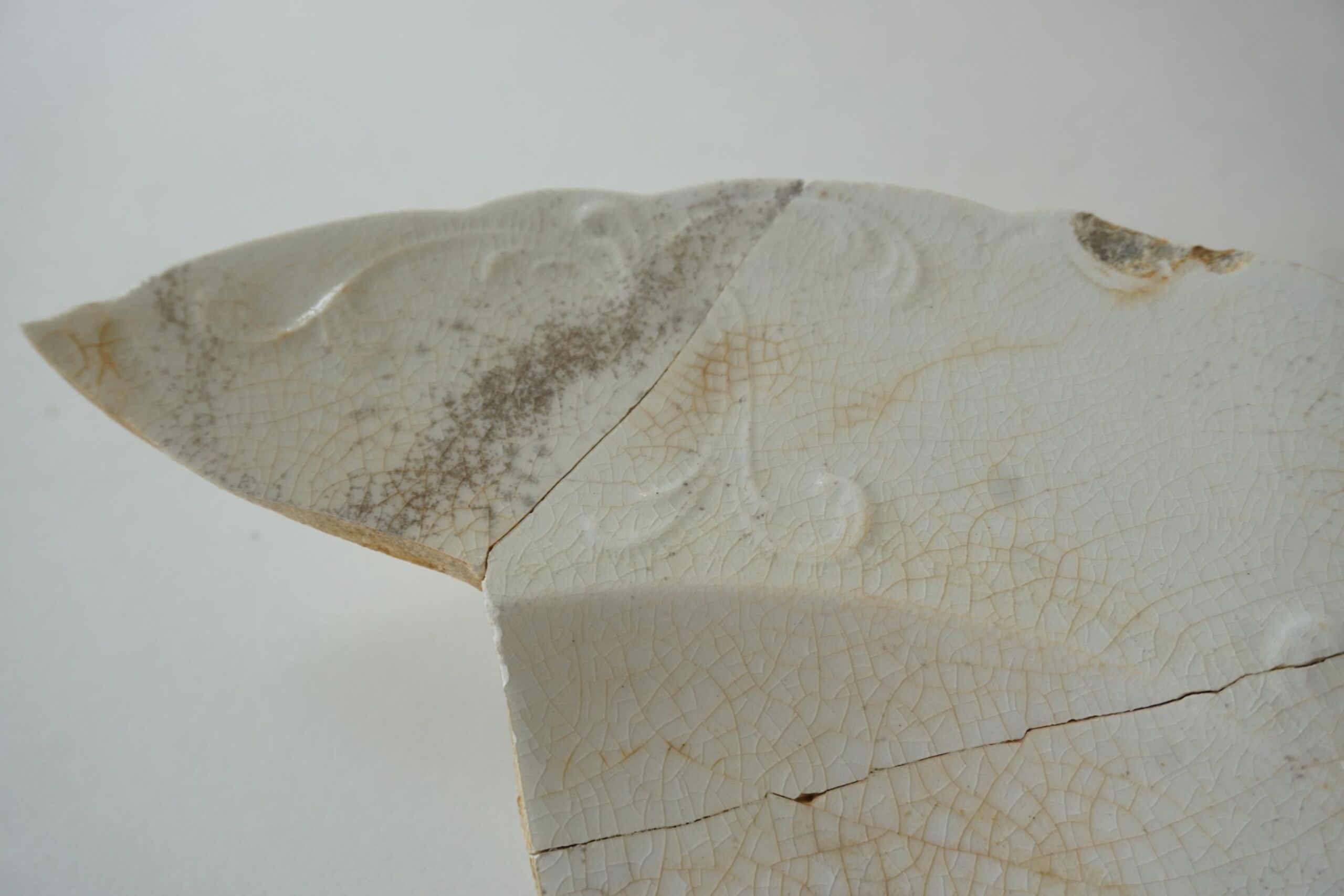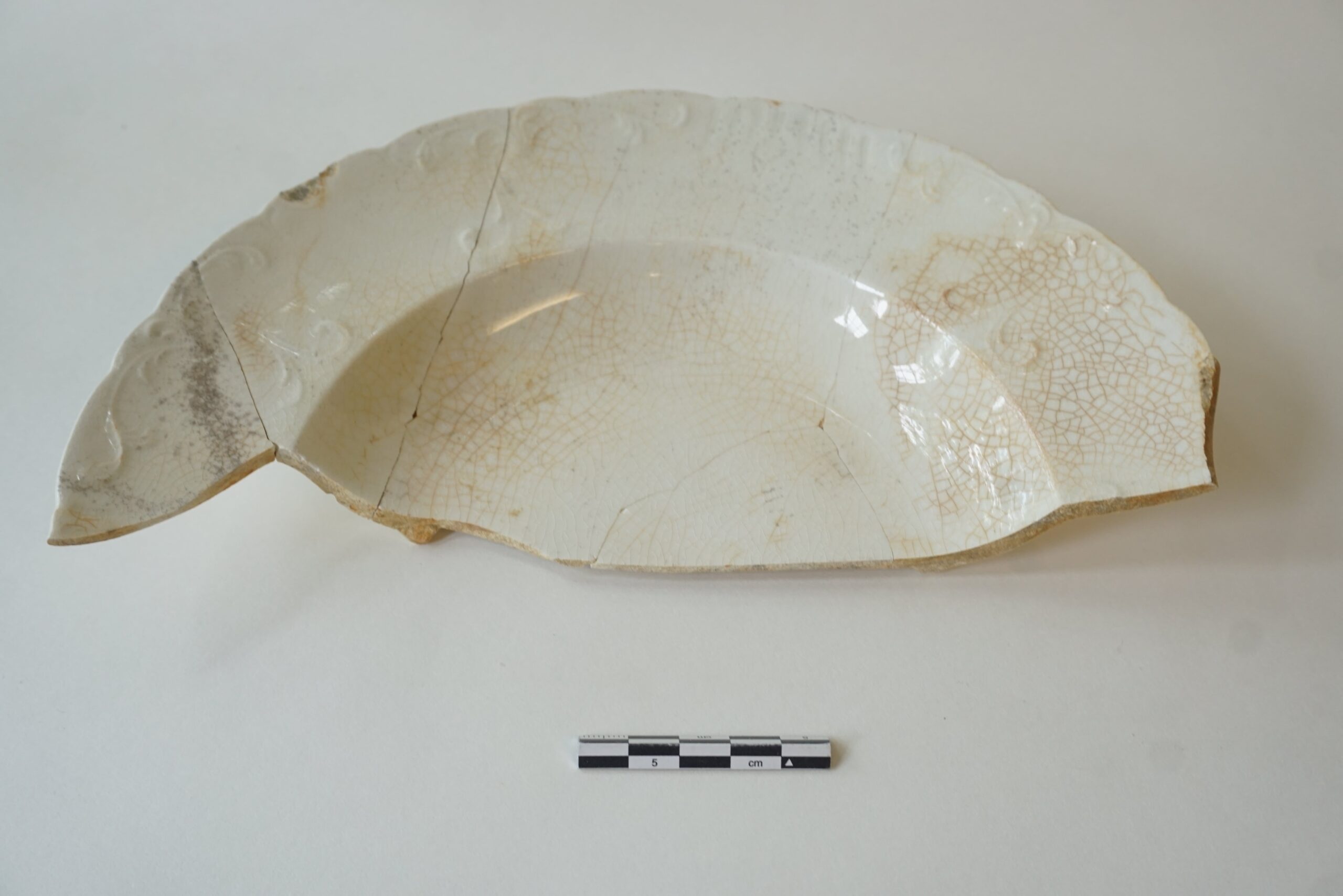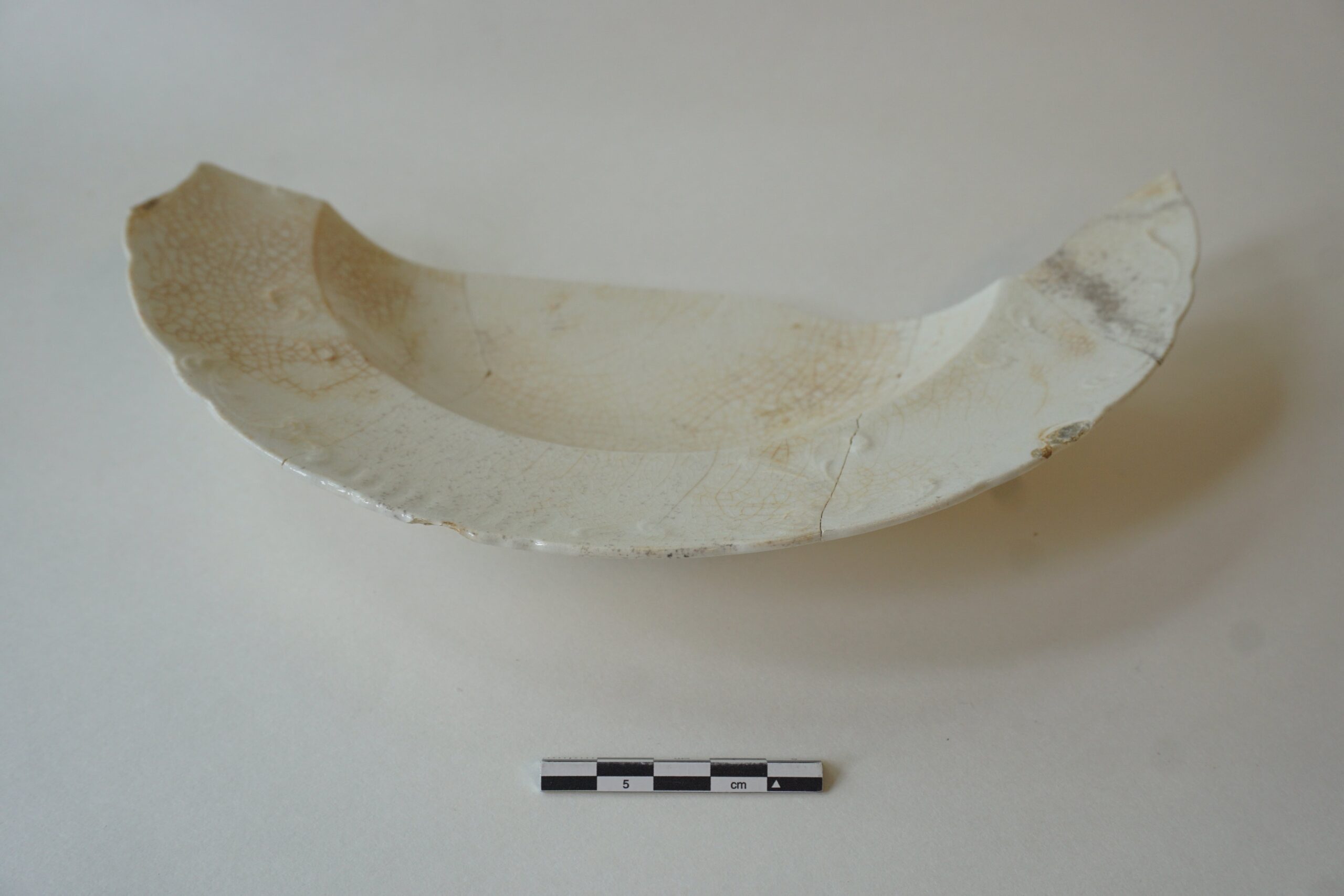 Shallow white dish with low ring foot, raised relief scrolling decoration around scalloped rim, Maker’s mark not visible