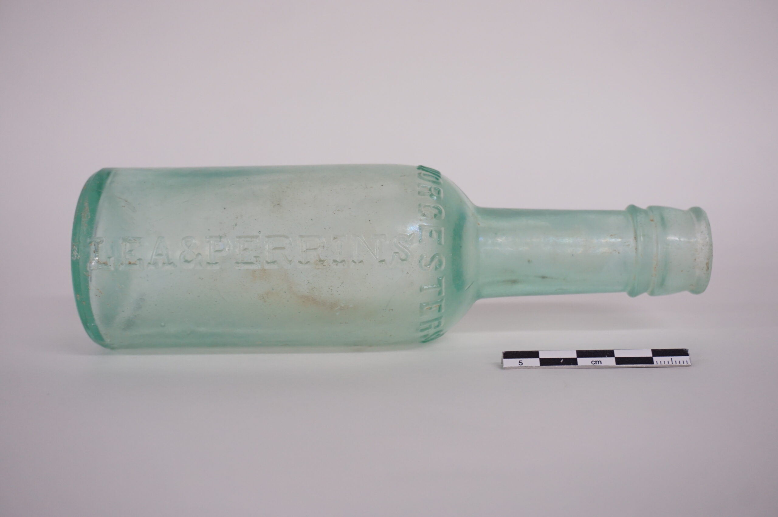 This bottle was likely made by Salem Glass Works (Salem, New Jersey) for Lea & Perrins.The letters “JDS” on their bases refer to the American distributor of the sauce, John Duncan and Sons. The bottle would have been originally sealed with a glass and cork stopper. Click here to see a glass stopper in our collection.