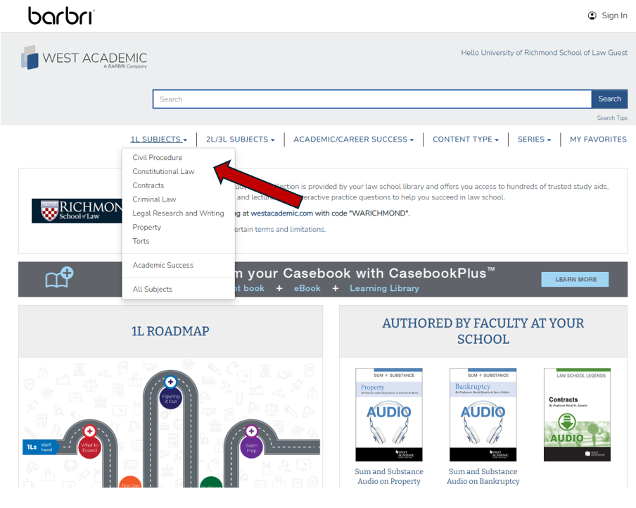 1. Open the homepage and select your course from either the 1L subject dropdown menu or the 2L/3L subject dropdown menu. In this picture, I selected Contracts from the 1L subject menu.