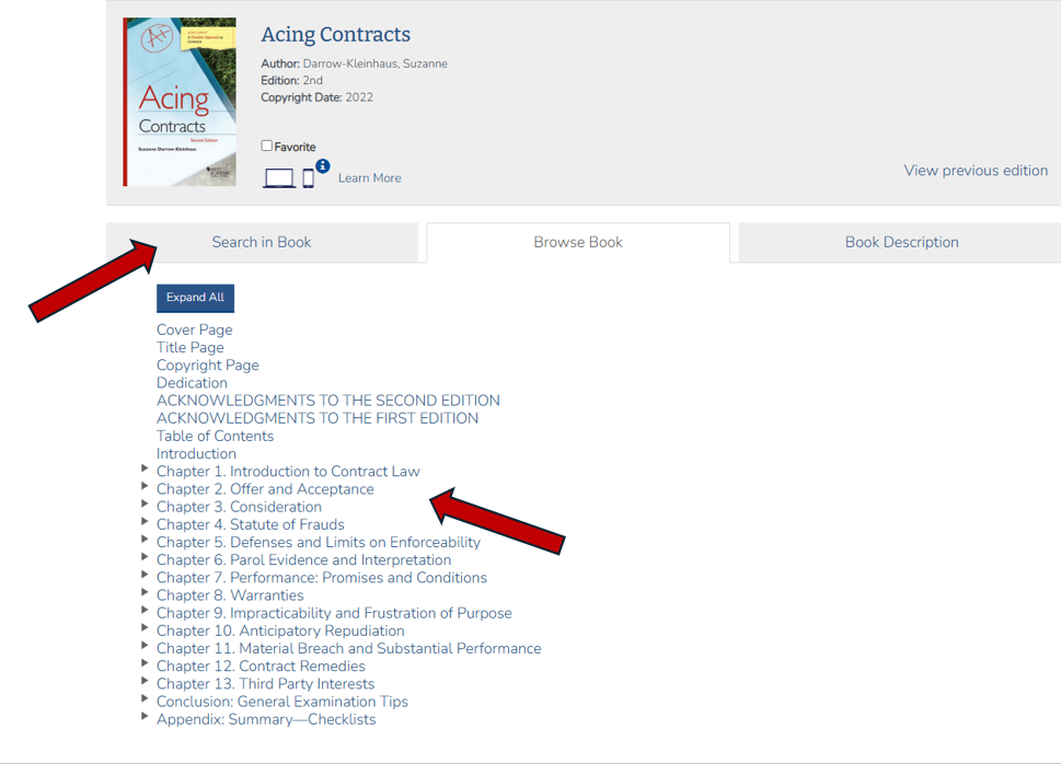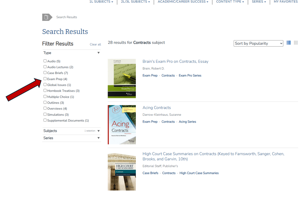 2. From there, I can filter the resource type. For example, I might filter by “Exam Prep” or “Outlines.” Then open the book of your choice (here, I opened Acing Contracts).