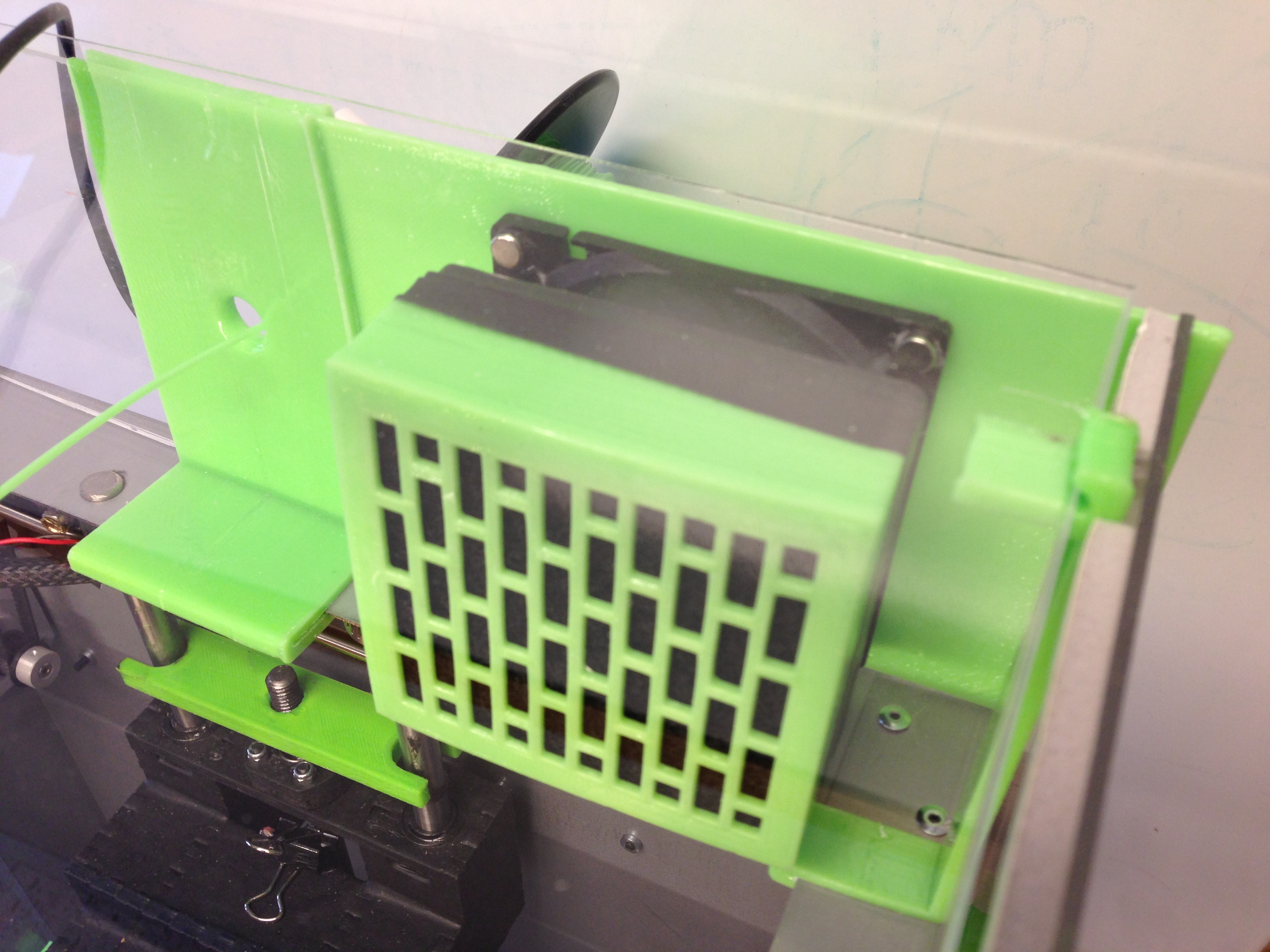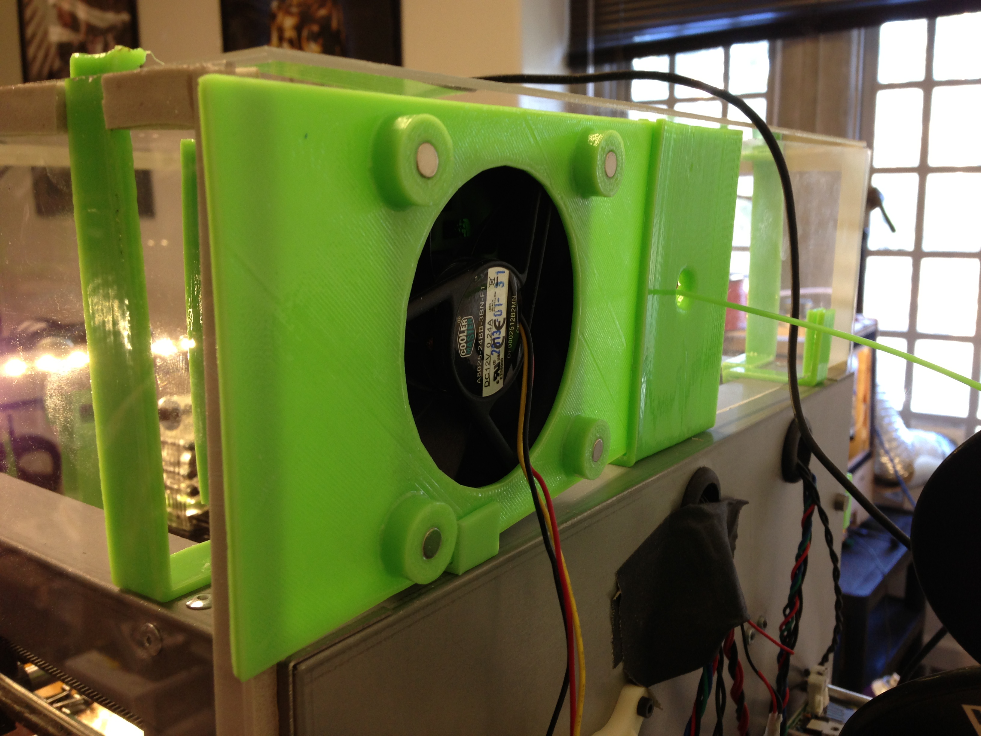 Once I decided to use an enclosure, I changed my mind from having an exhaust that would use the spool holder (and needs a large hole drilled into the rear metal wall of the printer) to using a spot on the plexiglass.  Since paeltz’s deisgn included a riser section (to allow room for the filament coming into the extruder assembly), I figured I could incorporate it there.  Then, I simply decided to replace one of the plexiglass pieces in paeltz’s design so I would not need to have a lot of cuts and shaping in the plexiglass.  Lastly, I chose to locate the filter inside the printer so it would not get in the way of the spool or electronics and would even be able to passively filter the area when the fan is not powered.  I had a lot of 1/4″x1/4″ cylindrical neodymium magnets so I decided to use those to hold all the parts together but make them easily removable.  Again, the details will be in a forthcoming thingiverse submission.