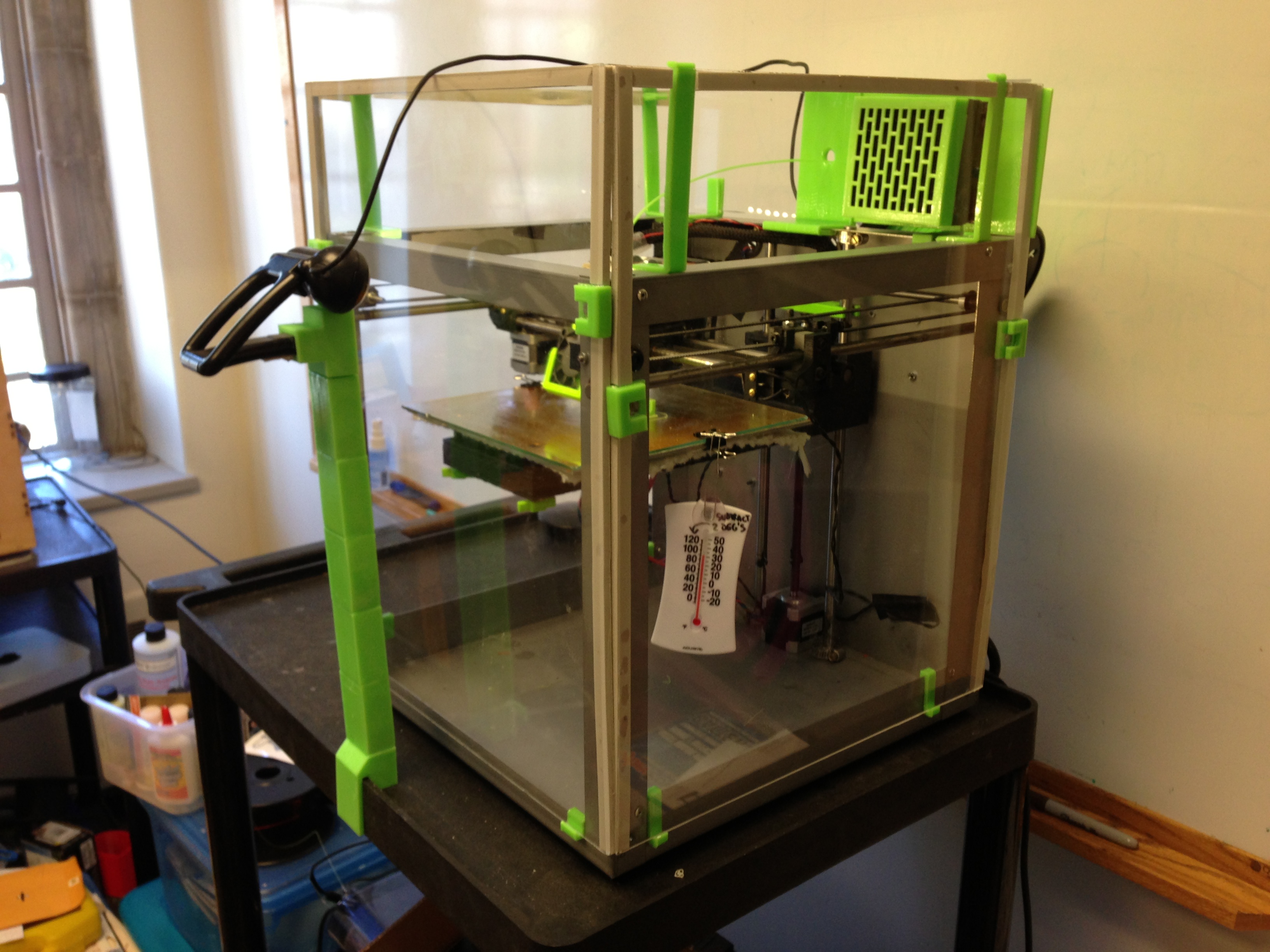 I admit that I did not design the enclosure.  We are using paeltz’s design that was posted on soliforum March 4th.  I printed out all the parts, bought the materials, and began assemblying.  I did not really modify anything but added an 80mm exhaust fan with carbon filters that I will soon add to thingiverse.  Even without attaching all of the weatherstripping yet, I am already getting stable printing temperatures in the enclosure of 32C.