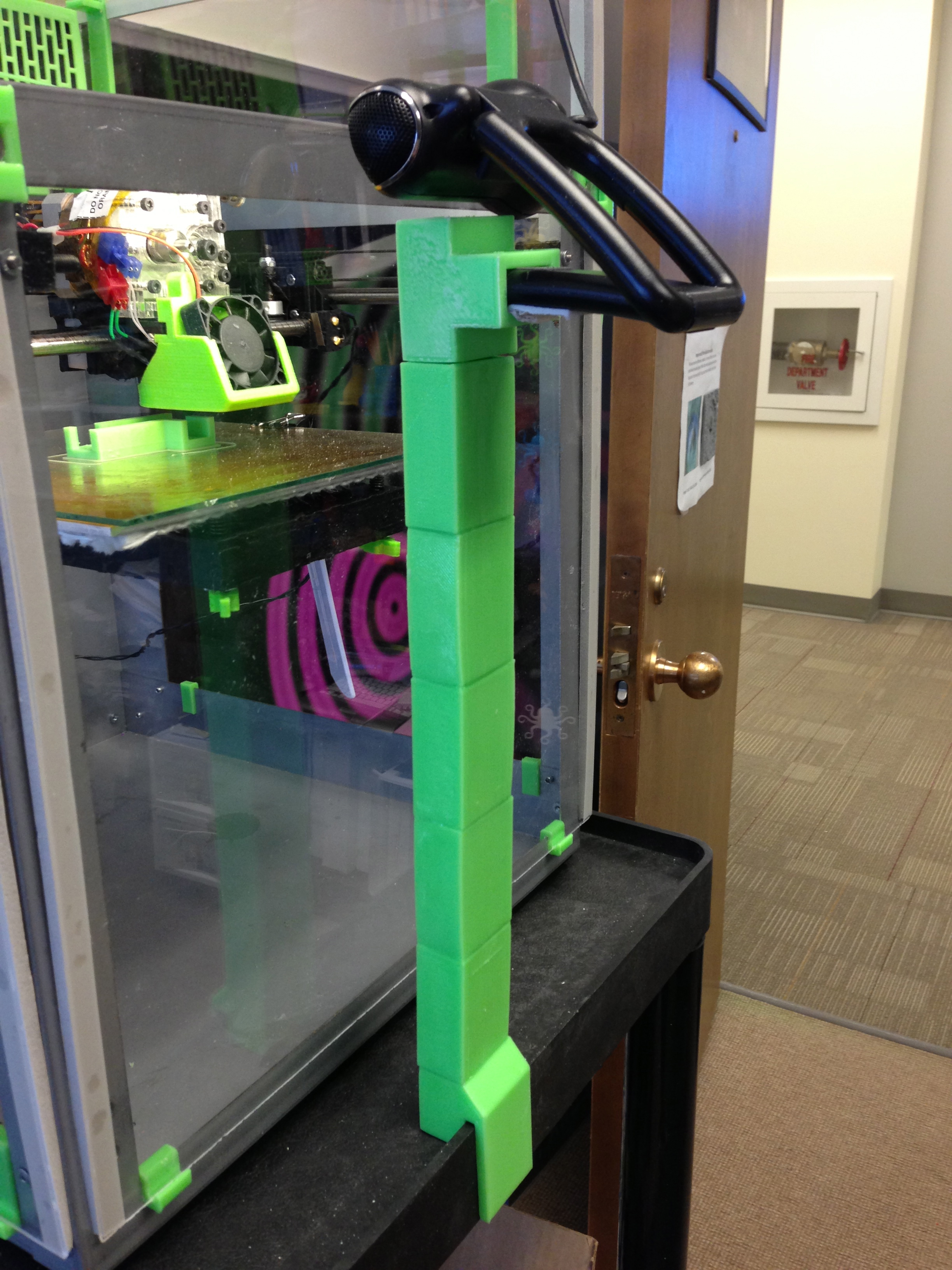 Up until now, I had used a simple adapter and mount for locating our Logitech webcams onto the frame for the Solidoodle 2 and 3.  The enclosure would get in the way so I figured I  would try another way to mount the webcam and test whether their is a drop in photo quality when the webcam is directly attached to the vibrating printer or from below.  I simply made a bunch of 3″ sections that had male and female ends to allow adjustable height.  Also, I made the bottom piece snugly attach to the cart holding the printer, and I adjusted the top piece to allow connection of different webcams.  In the end, I don’t know if what I have is improved over having something simply suction cup-mounted to the front section.  If it grows on me and/or I receive lots of requests, I’ll post it to thingiverse.