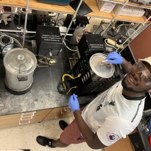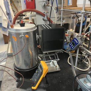 Professors Dominey and Goldman research lab designed the portion of a kugelrohr that would allow isolating the chemical compounds that their group synthesize. There is a glassware manifold that connects to a spherical flask in which one hopes to condense the vapors of the synthesized compound. To accomplish this, the flask is inserted into a kugelrohr that holds dry ice (at -109 ºF) which also helps insulate that environment from the laboratory.