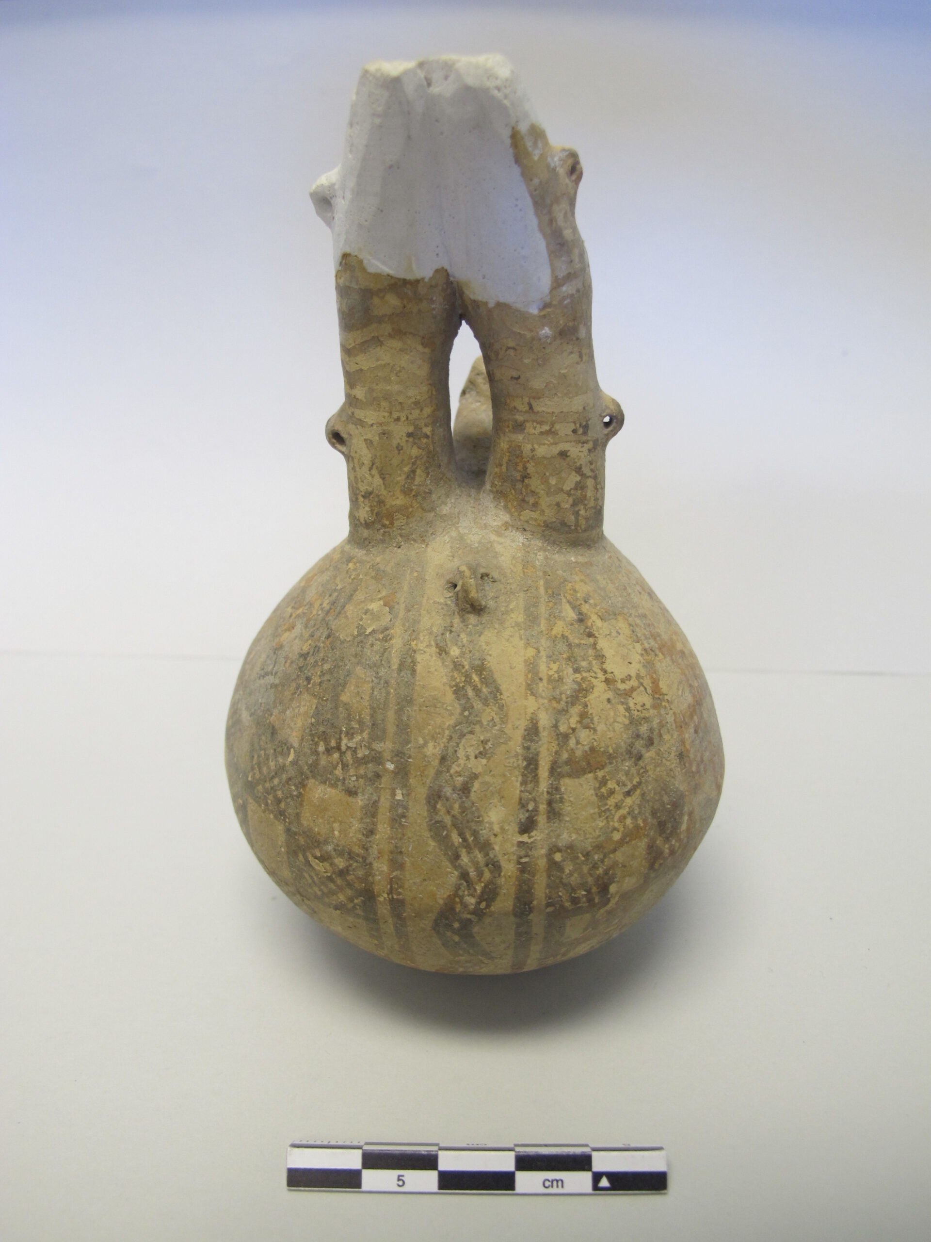 This small, double-spouted juglet exemplifies the ‘Stringhole Style’ of Middle Cypriot White Painted Ware with Geometric decoration. It was most likely used to carry small amounts of oil or wine. The tiny holes around the shoulder, neck, and handle once held string(s) for suspension. The double spout is very rare. Other juglets similar to this one usually have only one spout. The duplication of the spout probably served aesthetic rather than functional purpose.
