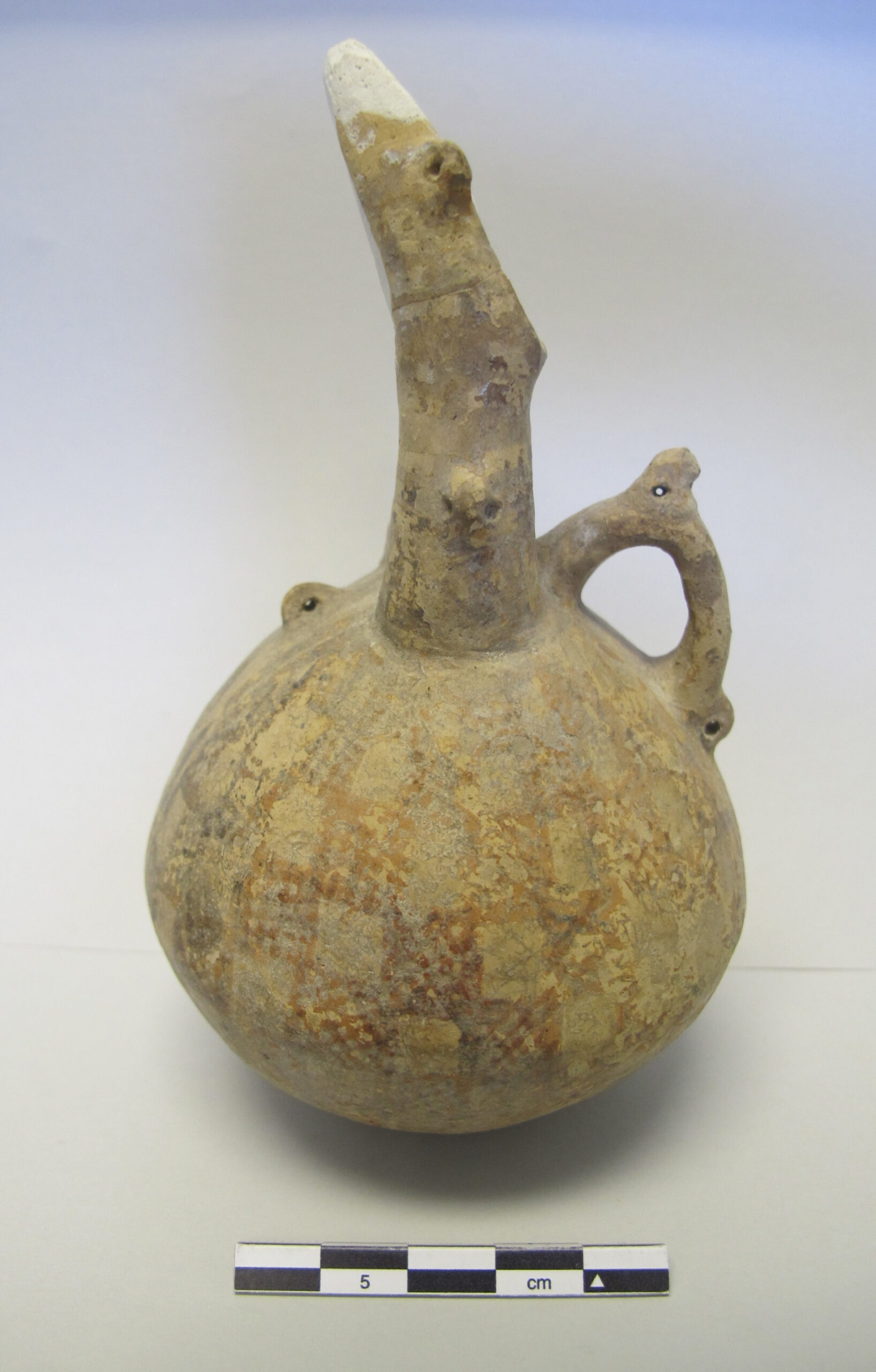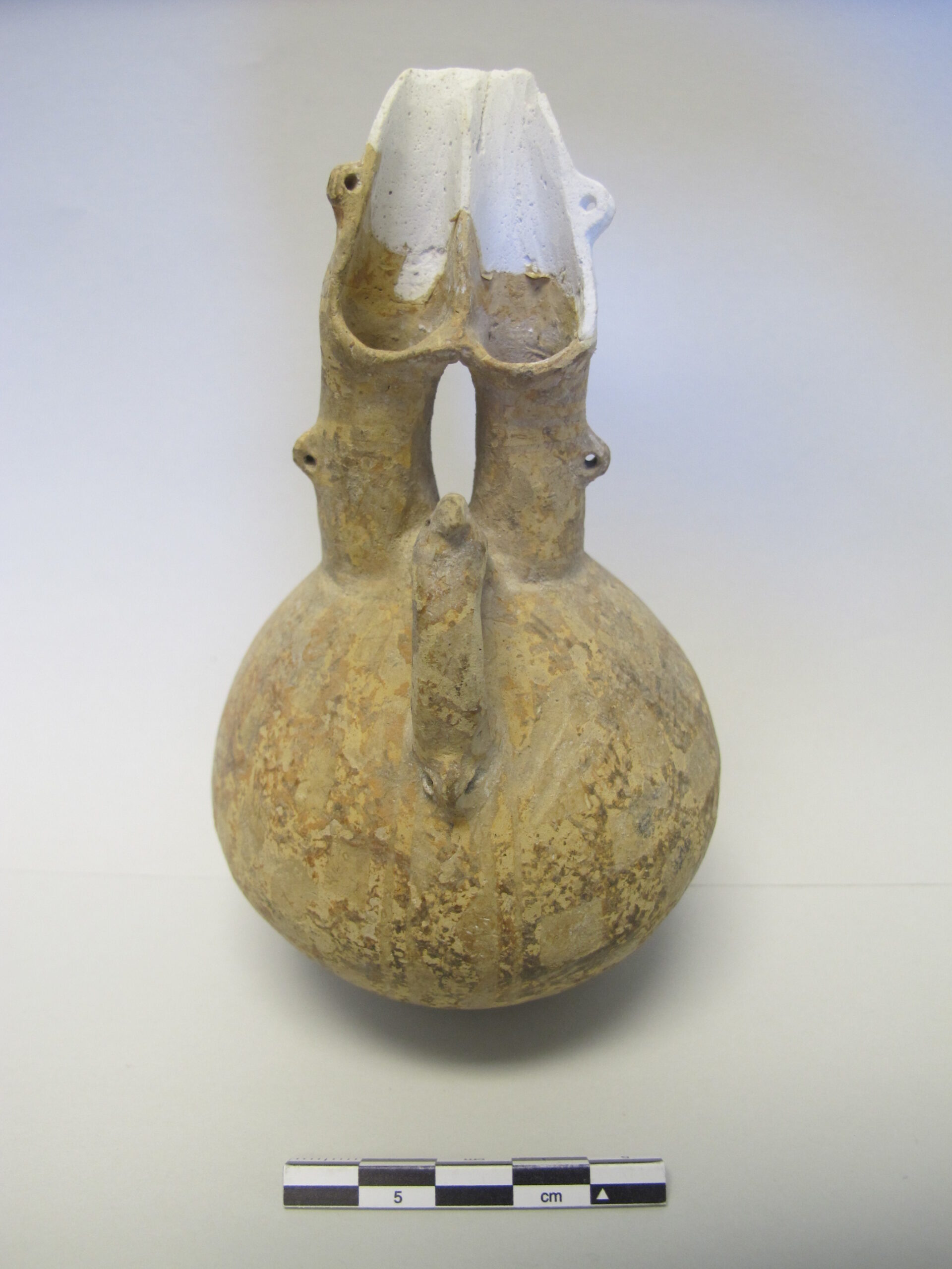 This juglet has a spherical round body and flat base. From the top of the sphere two tubular spouts, adjacent and connected to one another at the top, extend upwards. The spout mouths are angled at the top, for easy pouring. (This type of spout is often called beak-shaped, and jugs with spouts like this are known as beak-spouted.) On the side opposite the taller tips of the spouts is an arched vertical loop handle, with a tiny lug projecting from the top of the arch. A small hole in the lug would have held a string. Seven other small lugs pierced with string holes occur around the shoulder, neck, and handle.