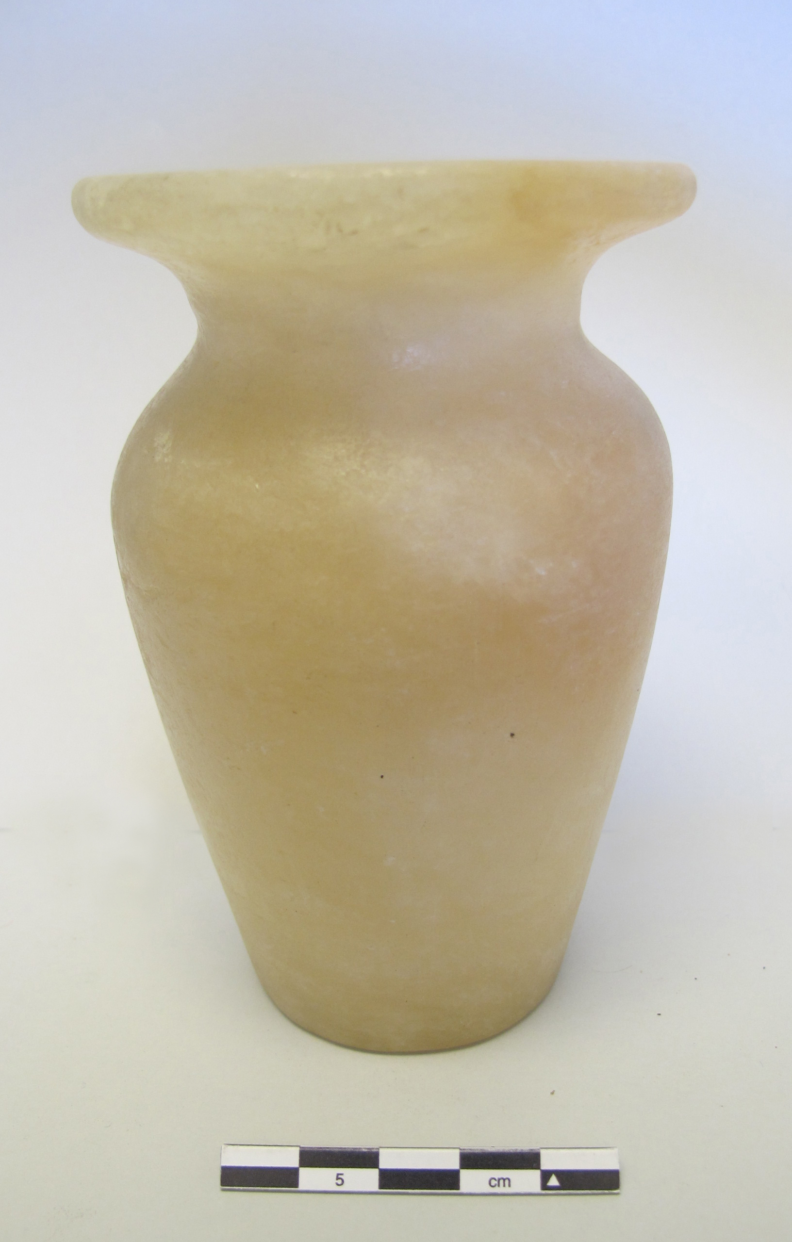 This small jar is composed of Egyptian alabaster, also known as calcite alabaster, which closely resembles genuine gypsum alabaster. Egyptians began carving this stone into vessels and other objects in the Early Dynastic period. Alabaster was widely used and prized by the ancient Egyptians since it was easy to work with and was also thought worthy of being possessed by the gods, perhaps because of its translucence. To make a vase like this one, a piece of worked flint or sandstone would be attached to the bottom of a post with handles affixed to the top to act as a borer, which would then be spun to carve the center chamber of the vessel. This method of carving the vessel creates the characteristic ridges seen inside many alabaster jars. Such jars could have been used as storage for every day or burial items. The small size of our jar suggests that it may have been used to hold perfume or oil.