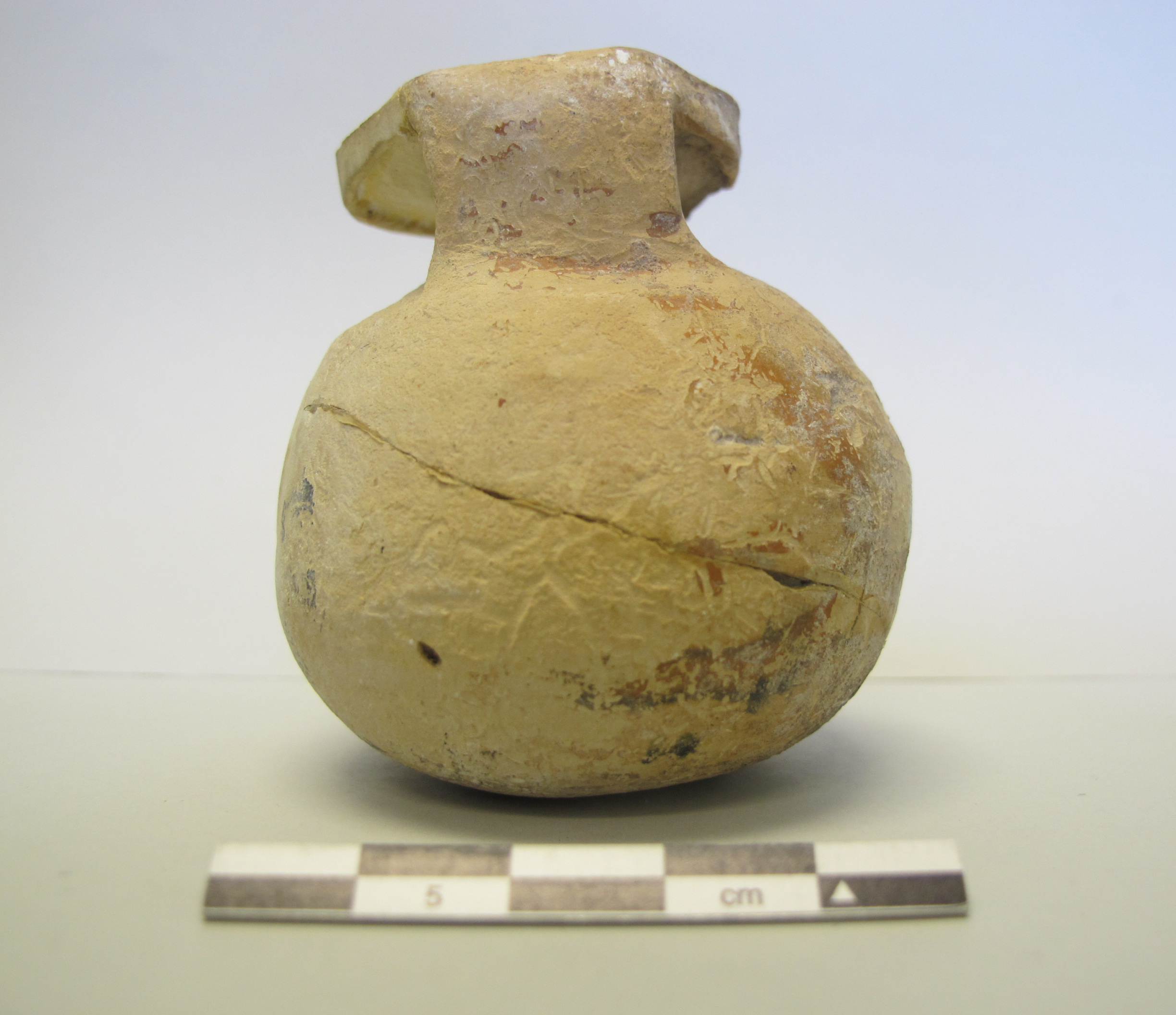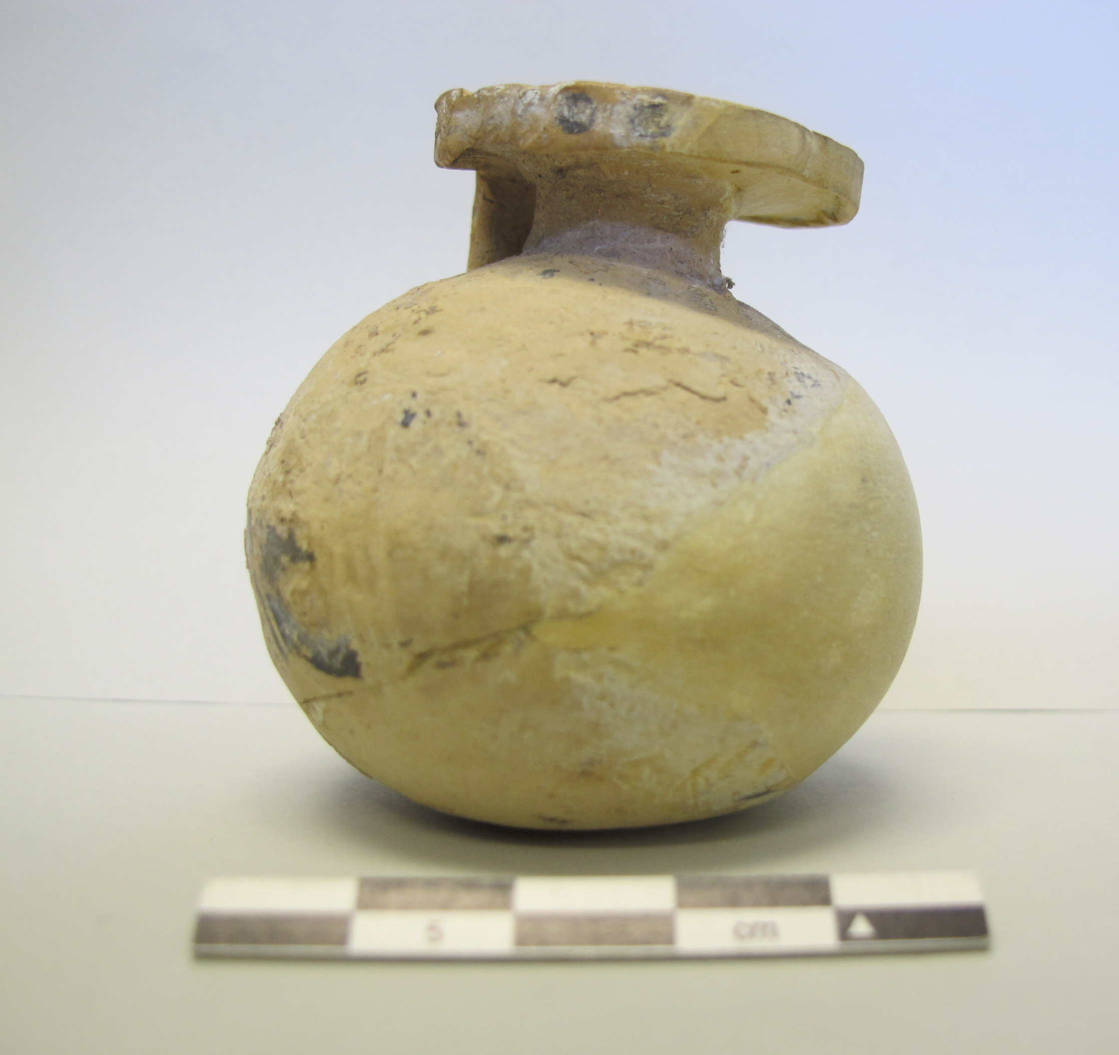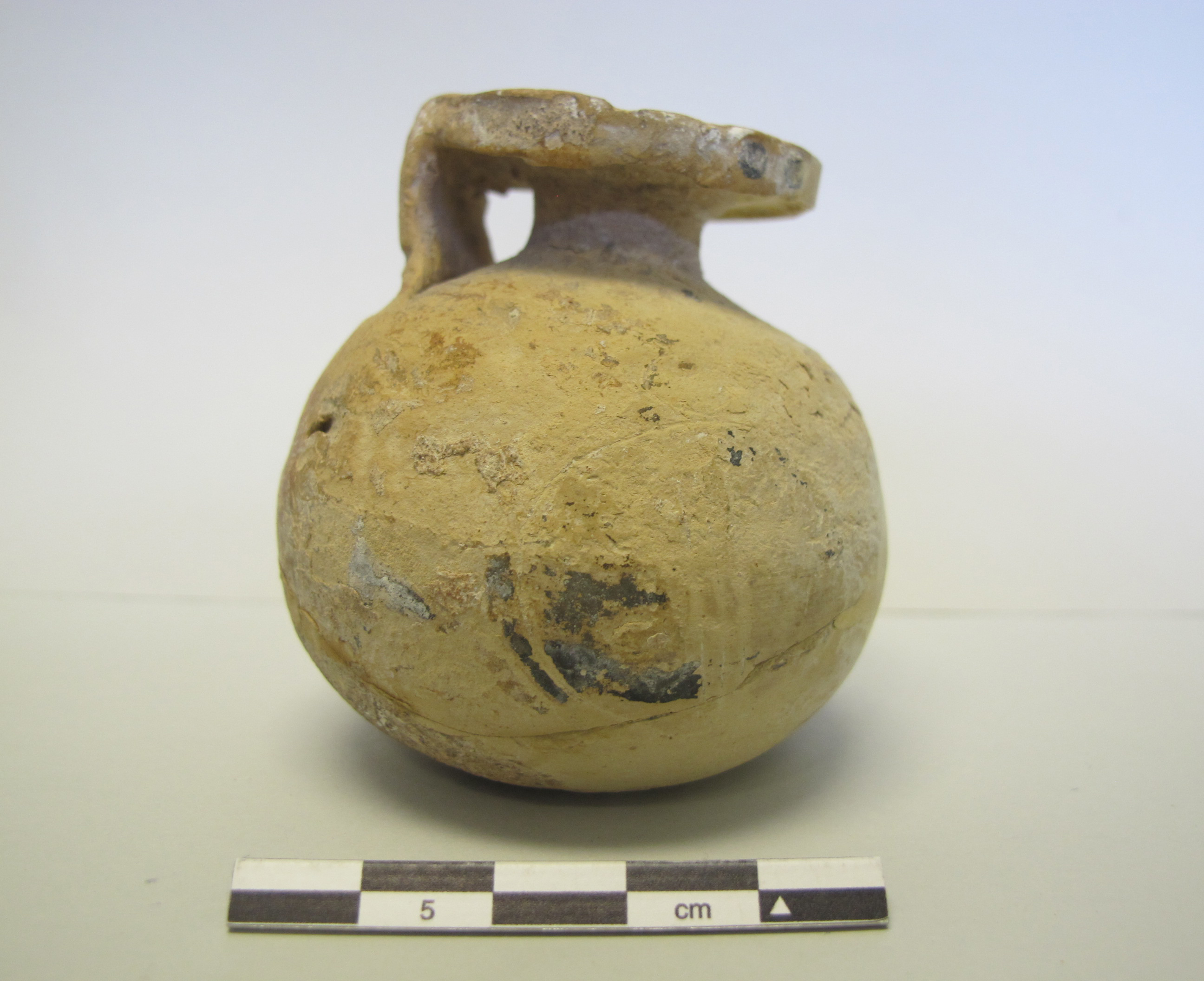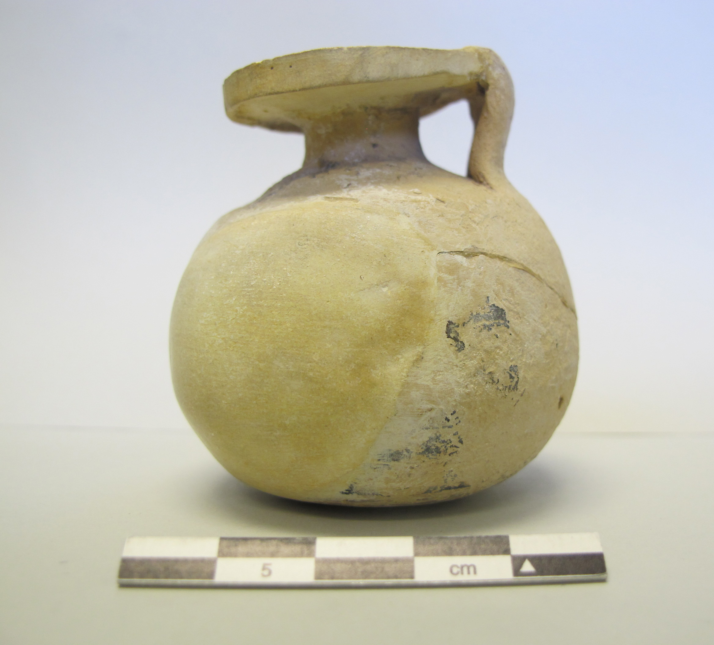 Globular body, with small neck and large, circular, and flat mouth with squared edge. Broad flat handle connects the body to the mouth. Round bottom with slight concavity in center.
