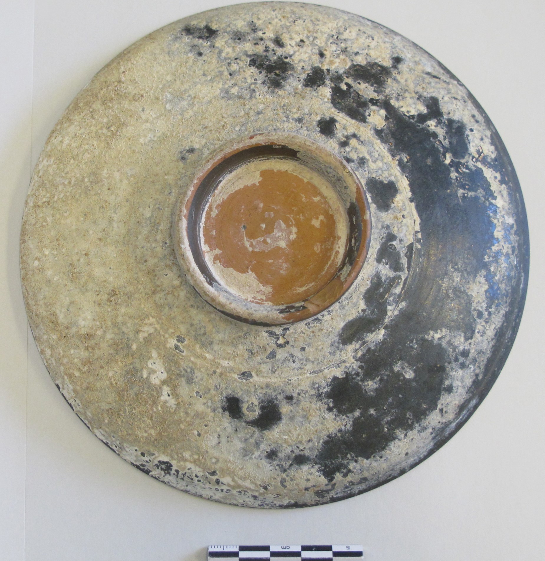 On the surface of the plate are three spots of dark staining on the glaze. These spots appear to be a form of rust and may point to a metal object resting on top for an extended period of time. Although the provenance of this object has been lost and it is unknown what exactly caused the rust and encrustation on the saucer, it was likely resting in the ground with a metal utensil or other object for a significant period.