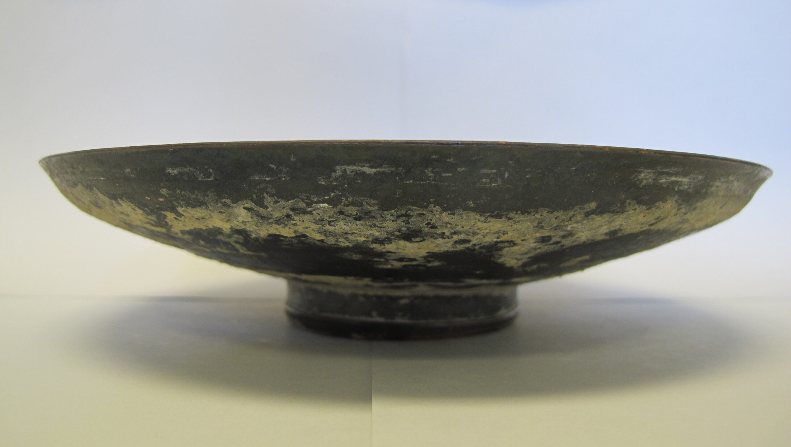 Likely used for small servings of food, small black-glazed dishes like this became very popular in the Hellenistic period, especially in the late 3rd century. Despite the mineral encrustation that covers much of this dish, its beautiful craftwork can be appreciated: the surface is smooth and seamlessly transitions from the flat rim to smooth underside, and the metallic black slip evokes the appearance of silver. The dish also gives insights into the production process. The lighter color in the center of the interior results from stacking in the kiln – known as a ‘stacking circle,’ the area corresponds to the ring foot of another dish stacked above it during the firing process. The ‘seam’ around the bottom likely represents where one application of the slip ended and the next started.