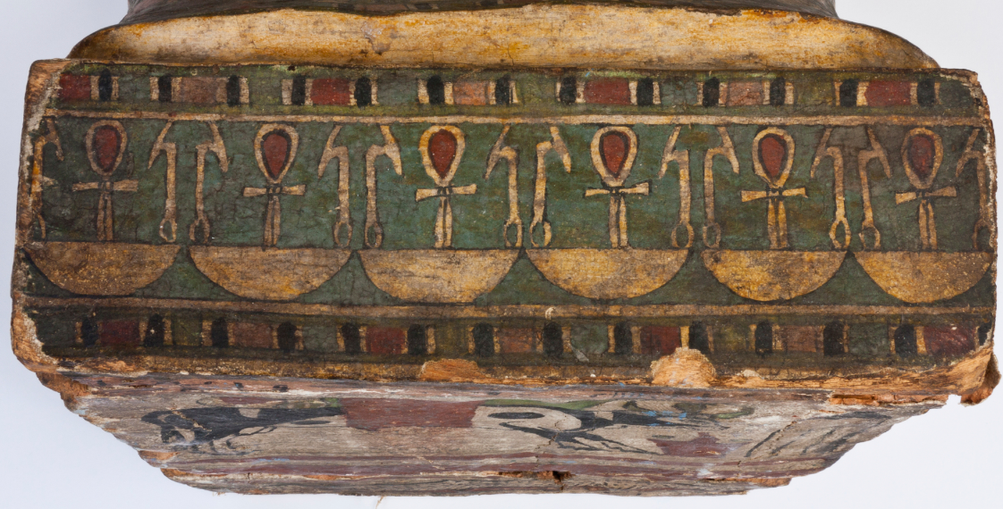 The pattern decorating the top of the foot of the coffin consists of repeating ankhs and was scepters, which had stylized ram’s heads. The was scepter is a symbol of protection; the ankh symbolizes eternal life. Both were also common symbols on amulets.