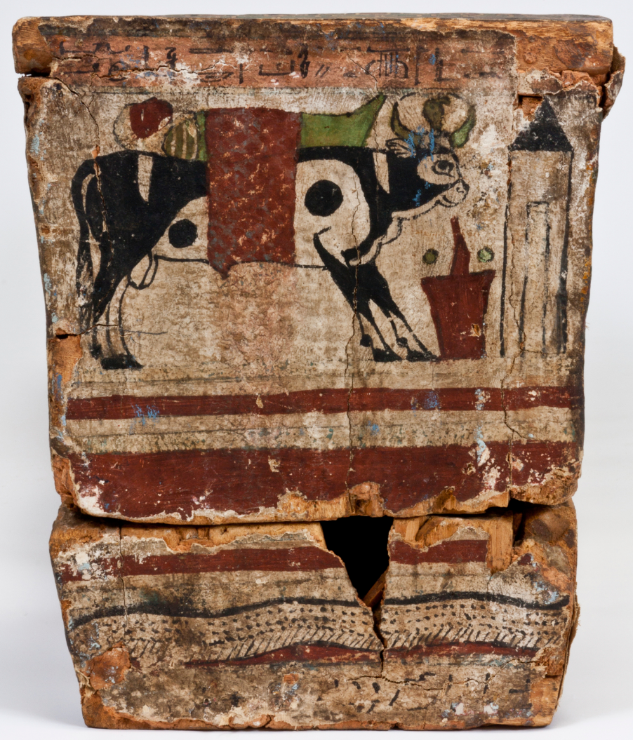 The sacred Apis, a black and white bull, revered by Egyptians as a living god, was often depicted on the foot of the coffin. In the Afterlife, Apis would carry the dead on his back toward a tomb.