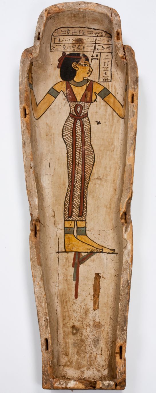Both inside faces of the coffin feature the goddess Nut with arms outstretched to embrace Ti-Ameny-Net’s body. Nut wears a dress made of a net-like material and a red girdle resembling the Knot of Isis, a common protective design. Nut was the sky goddess and also the mother of the gods.