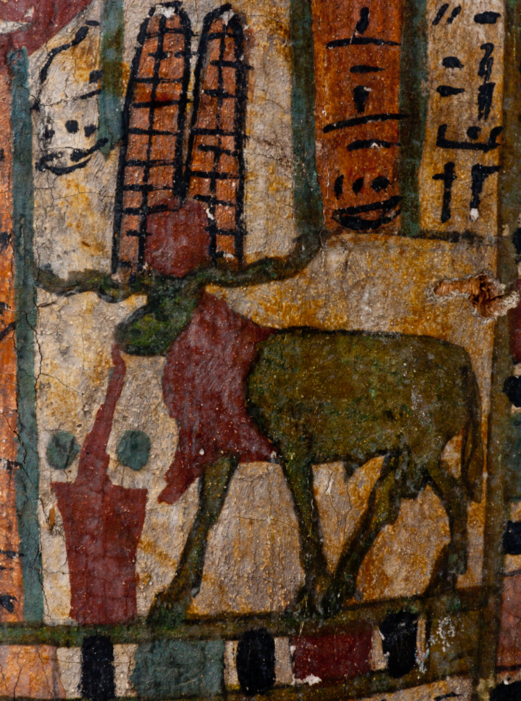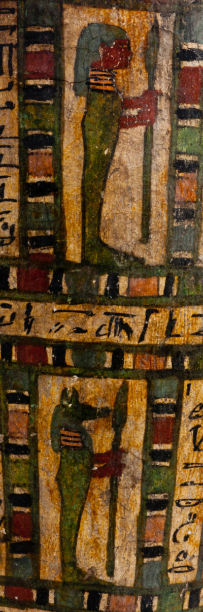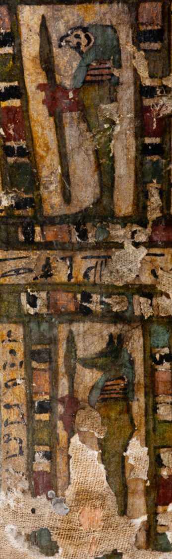The Four Sons of Horus offer prayers for Ti Ameny Net on the sides of her coffin. They each protected different organs of the body that the Egyptians also preserved: Imsety, the man who protected the liver; Duamutef, the jackal who protected the lungs; Hapy, the baboon who protected the stomach; and Qebehsenuf, the large falcon who protected the large intestines.