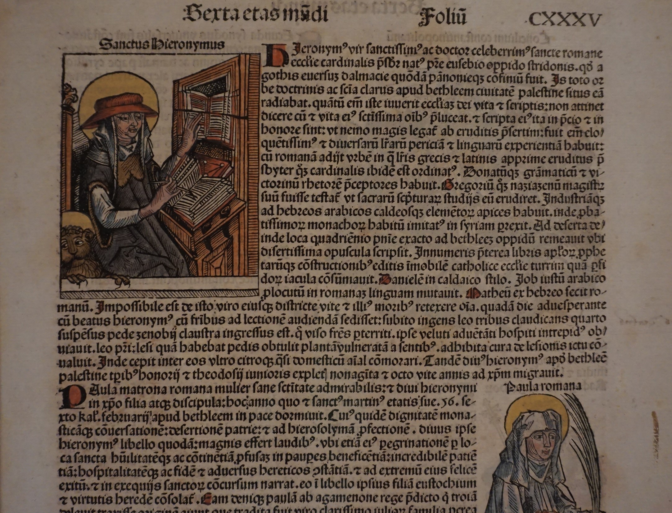 On page 135v, the topline reads “Sexta aetas mundi” (“Sixth Age of the World”). 19 letters beginning sentences are highlighted in red ink, and the same red appears in three of the four colored images throughout the page. The largest image in the top left corner of the page depicts multiple figures, many dressed in biblical and regal garb. The caption helps to identify the scene as the Second Ecumenical Council, held in 381 CE at Constantinople. Three other images depict other rulers of the time, including Radagasus and Alaric, kings of the Goths. The other side, page 135r, features six images of figures. The largest in the top left corner depicts Saint Jerome (Hieronymus) writing in a book, with the lion he had healed and adopted as a pet peeking out of the lower left hand corner. The other five figures, towards the bottom of the page, wear varying kinds of clothing and each holding different objects. There are some handwritten marginal comments on each side.