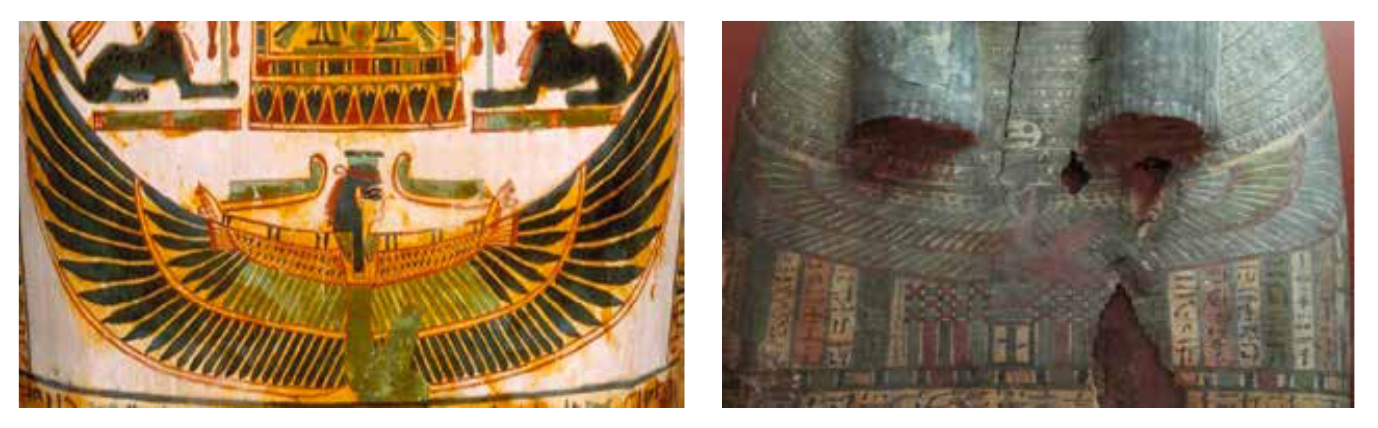 While coffin designs changed through the centuries, much of the imagery remained the same, such as the motif of Nut with outstretched wings. The function of this protective goddess did not change with time, so coffins from many time periods in Egyptian history depict Nut “embracing” the deceased.