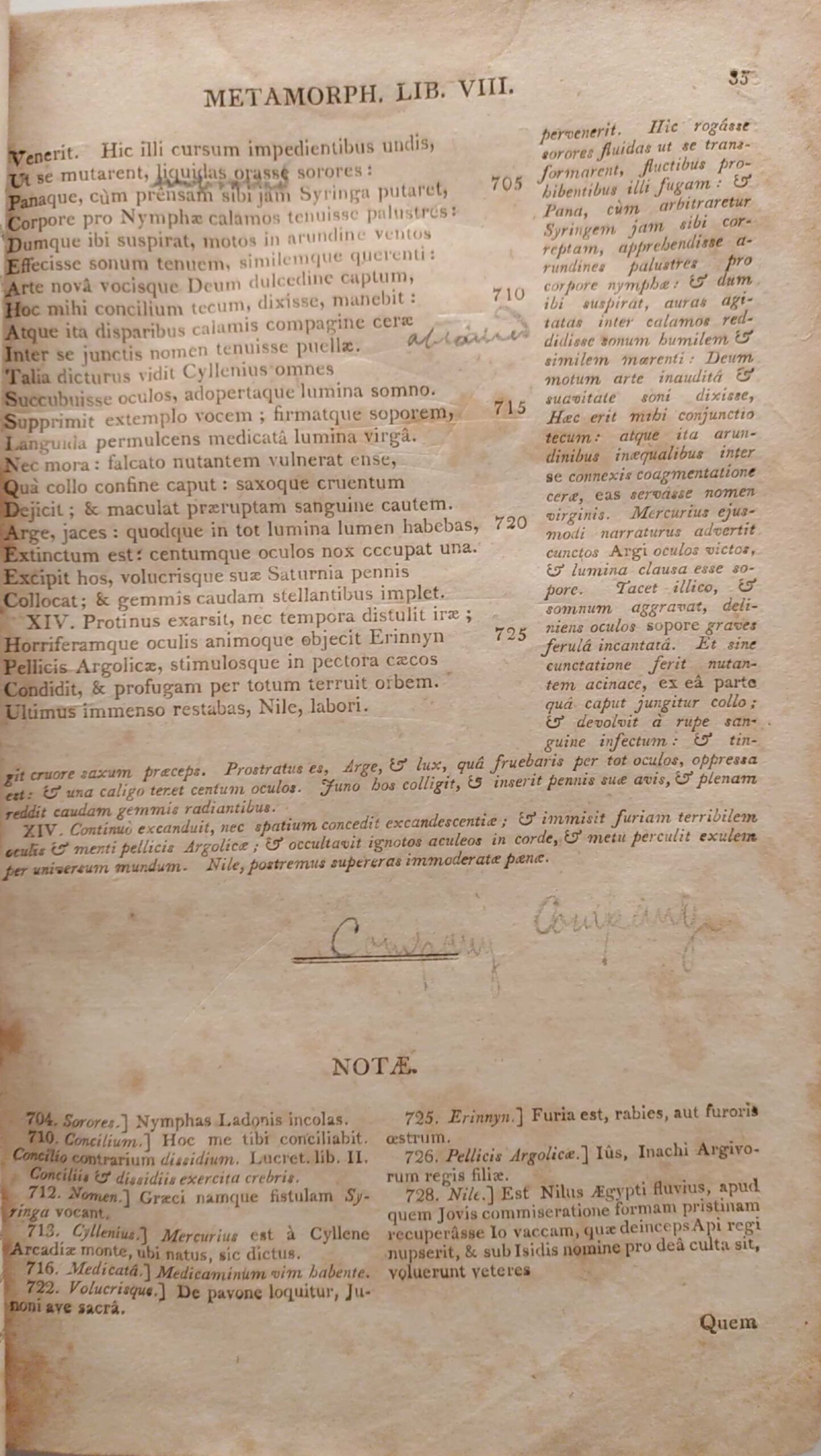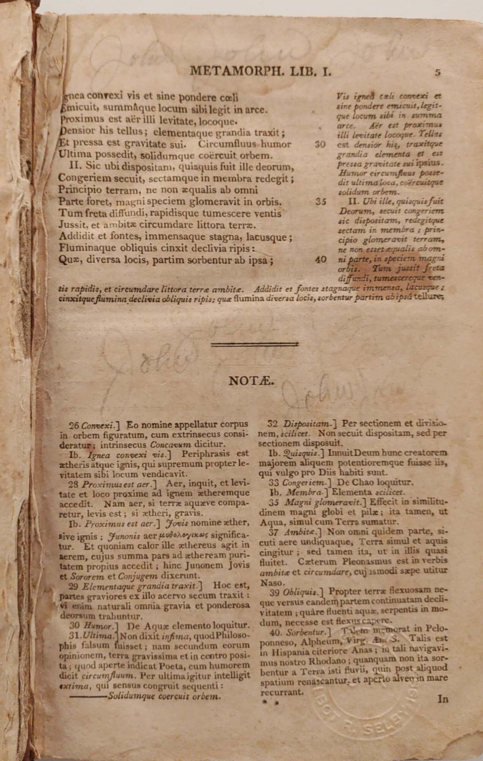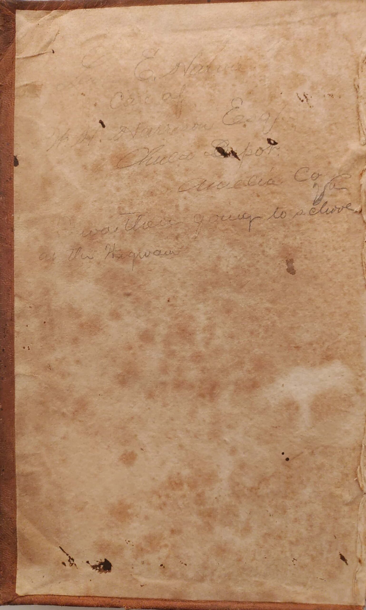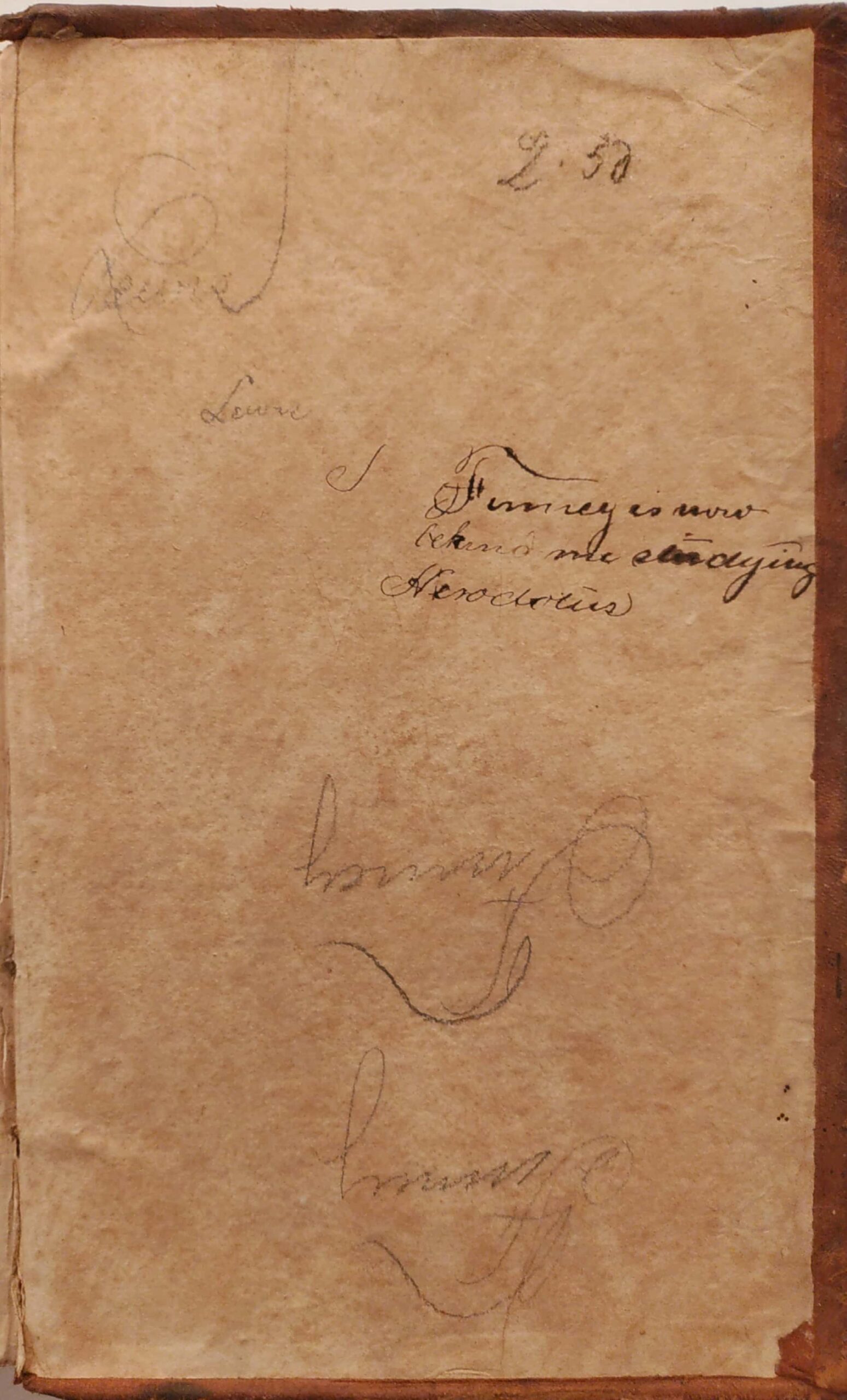 The annotations on this edition of Ovid give us a hint as to where this particular book may have come from. The writing on the inside front cover reads “Lewis E. Harvie, Care of W.H. Harrison Esq… Amelia Co Va.” Directly below is another note: “I was there going to school at the Wigwam.”