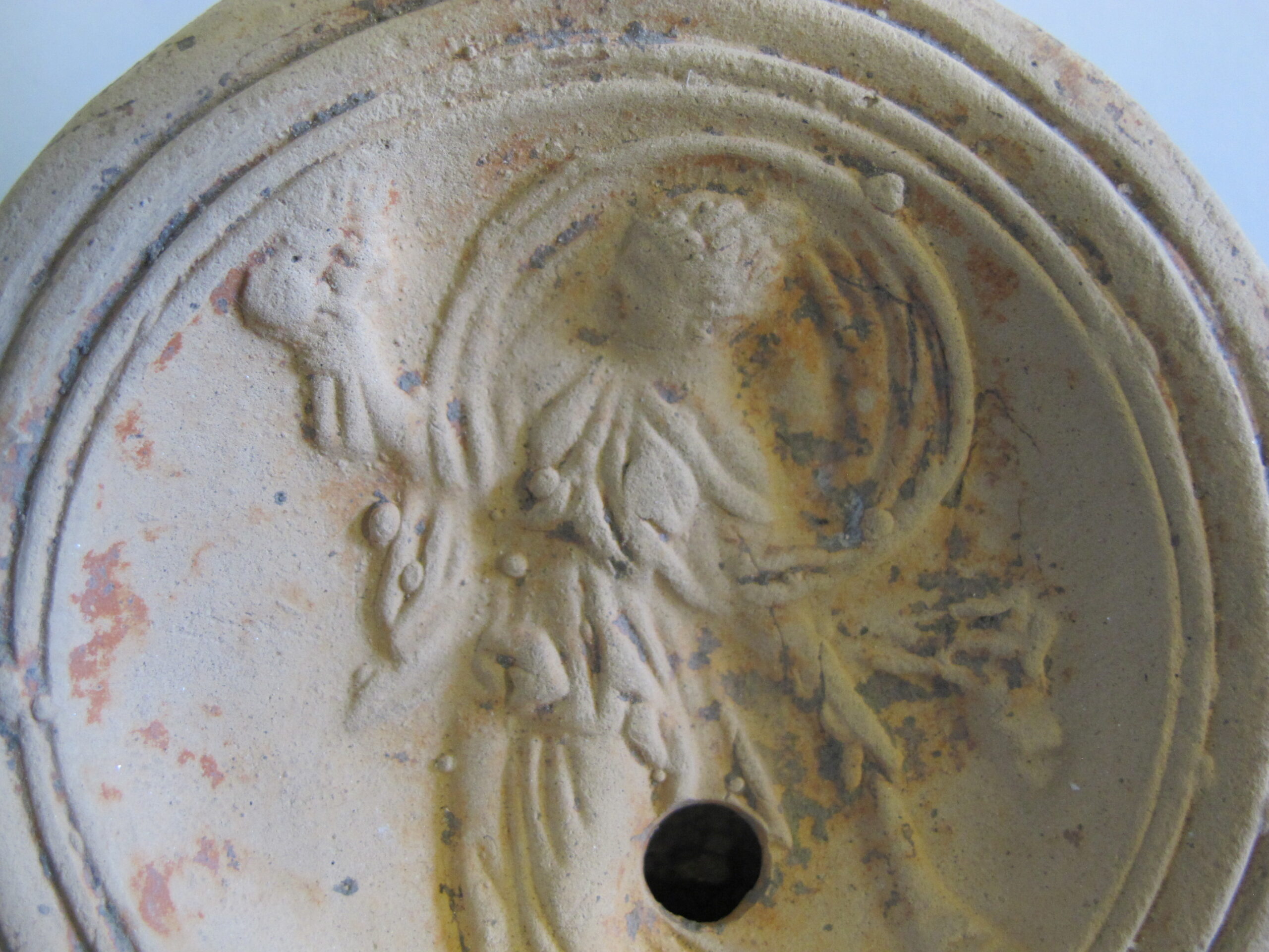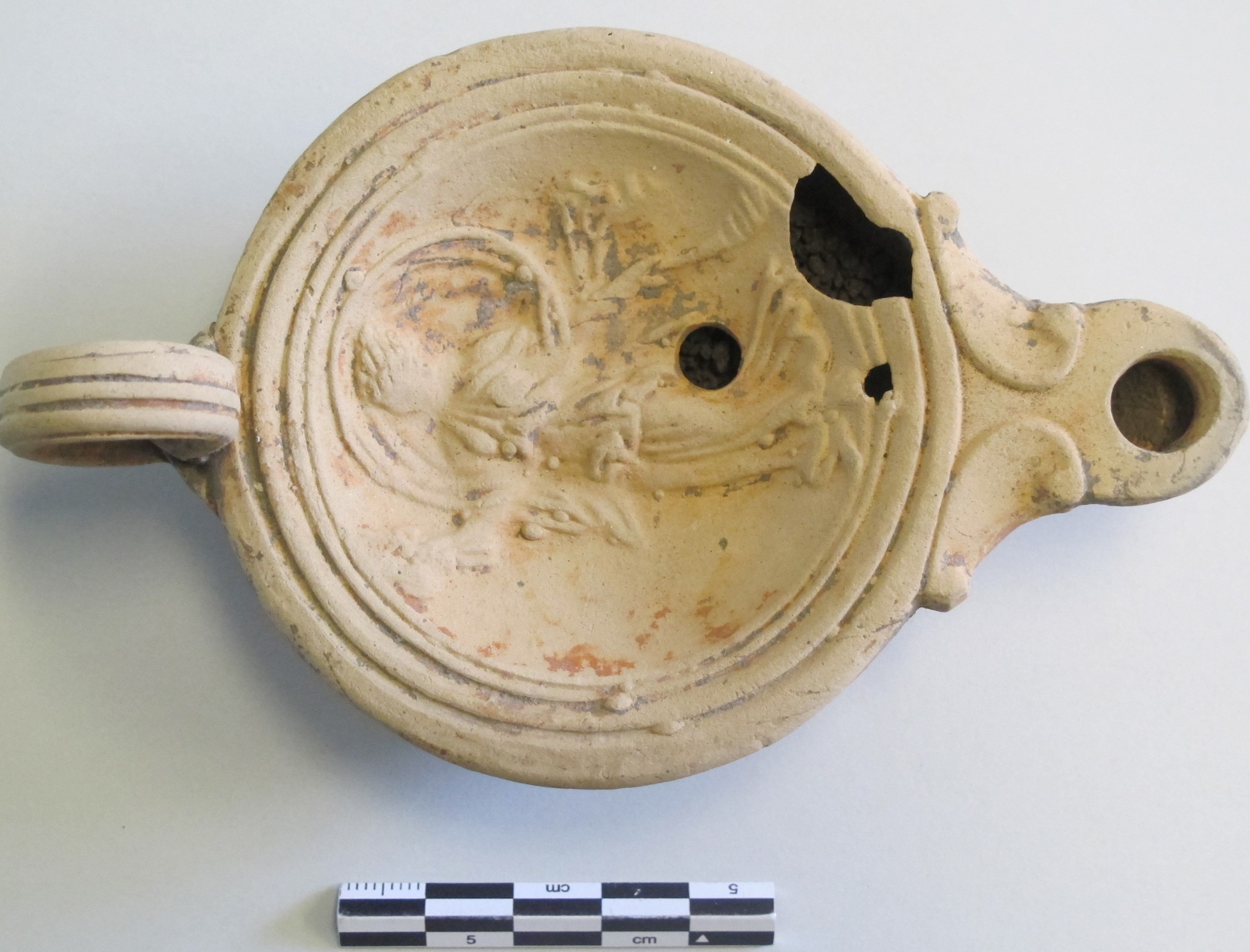 From the estate of May Keller, this volute-nozzle lamp is said to be from Pompeii and is most likely from around the first century BCE to the first century CE. The figure is probably some type of mythical figure, a common theme for ancient lamps, but it is uncertain who she is exactly. Initially, it was suggested that she could be some type of maenad, a female follower of Dionysus. However, based on comparanda, specifically British Museum Q1525 PBR, the figure is more likely a goddess, specifically Ceres, Proserpina, or Luna (Bailey 1983, 160). Each of these goddesses have specific elements that often appear in their depictions. For instance, Ceres is often depicted with poppy imagery, a torch, and a veil and crown (Spaeth 1994, 68-72). While it is possible that the figure holds poppies in her right hand and a torch in her left, the details are so indistinct that it is impossible to say for sure. This kind of lamp was made using a mold. Mold-forming of lamps involved stretching large sheets of clay, cutting them down to the correct size for the mold, then pressing the clay into the mold. This process could only take place under certain light and space conditions, meaning that specific rooms were often dedicated to the process of mold-forming (Peña and McCallum 2009, 71). Recent excavations for Pompeii have revealed an excess of new information about Roman pottery, and there is evidence that the Via di Nocera pottery production facility was manufacturing mold-made lamps like this one (Peña and McCallum 2009, 57, 78).