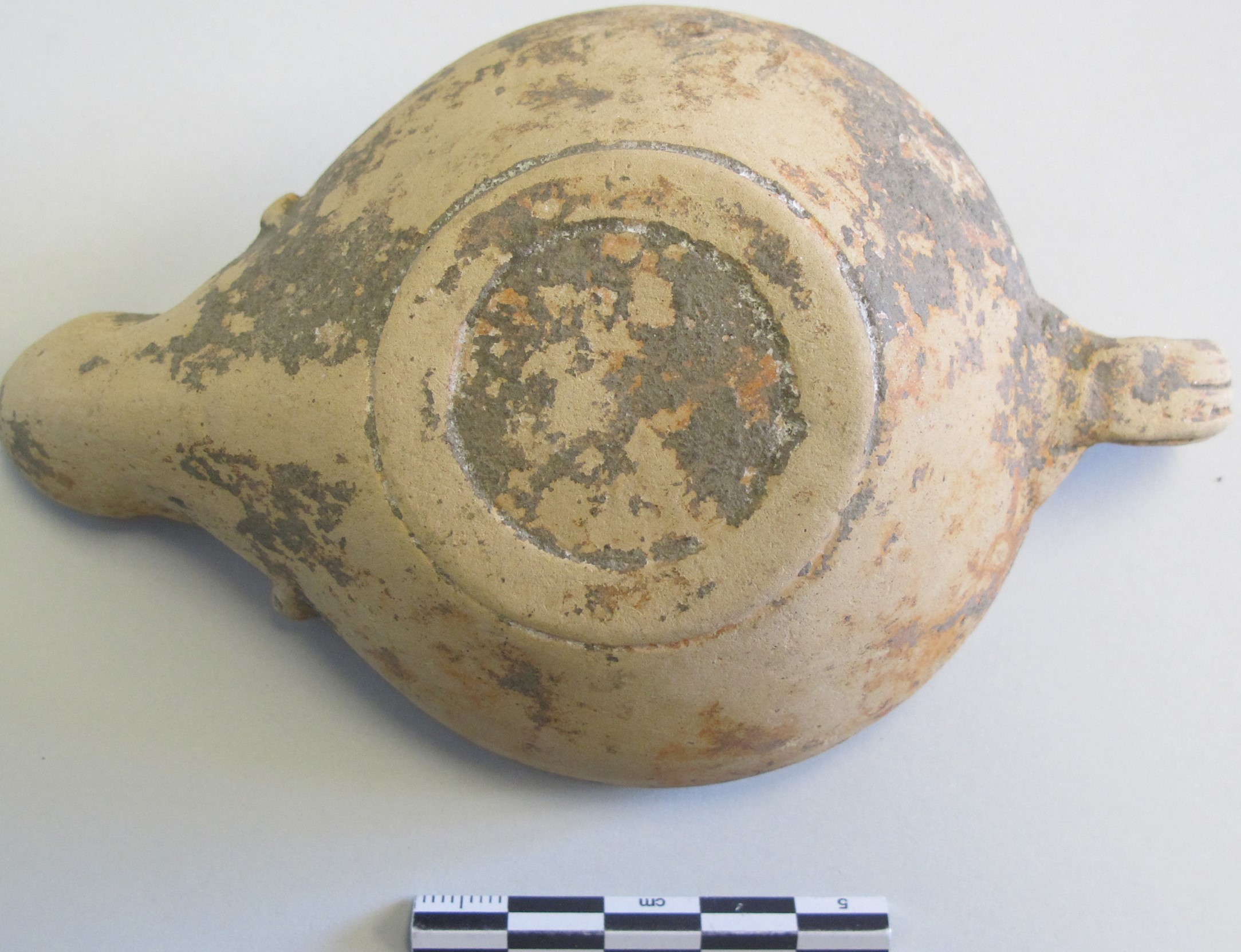 Mold-made from a buff-colored clay, traces of reddish glaze or slip; shallow, closed, body with a small, off-center hole; and a relief of a dancing woman in the center, framed by four rings, small chip in the relief. The nozzle protrudes from the body, flanked by volutes at the base and reaches out to form a round top pierced with a hole; circular loop handle decorated with three bands at the top.