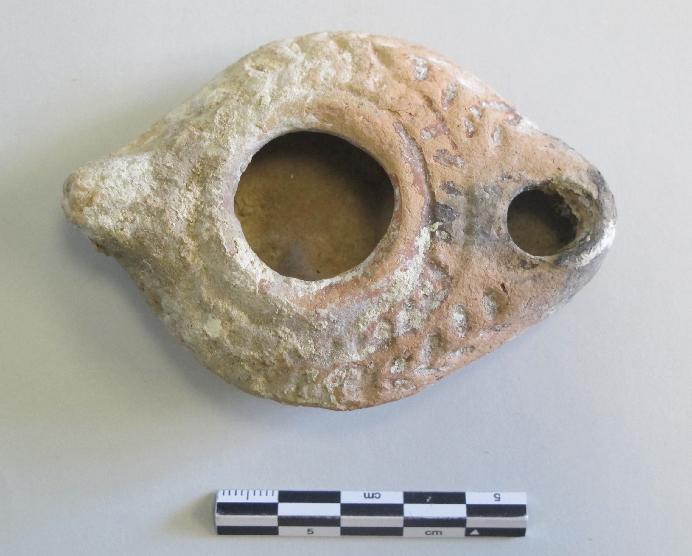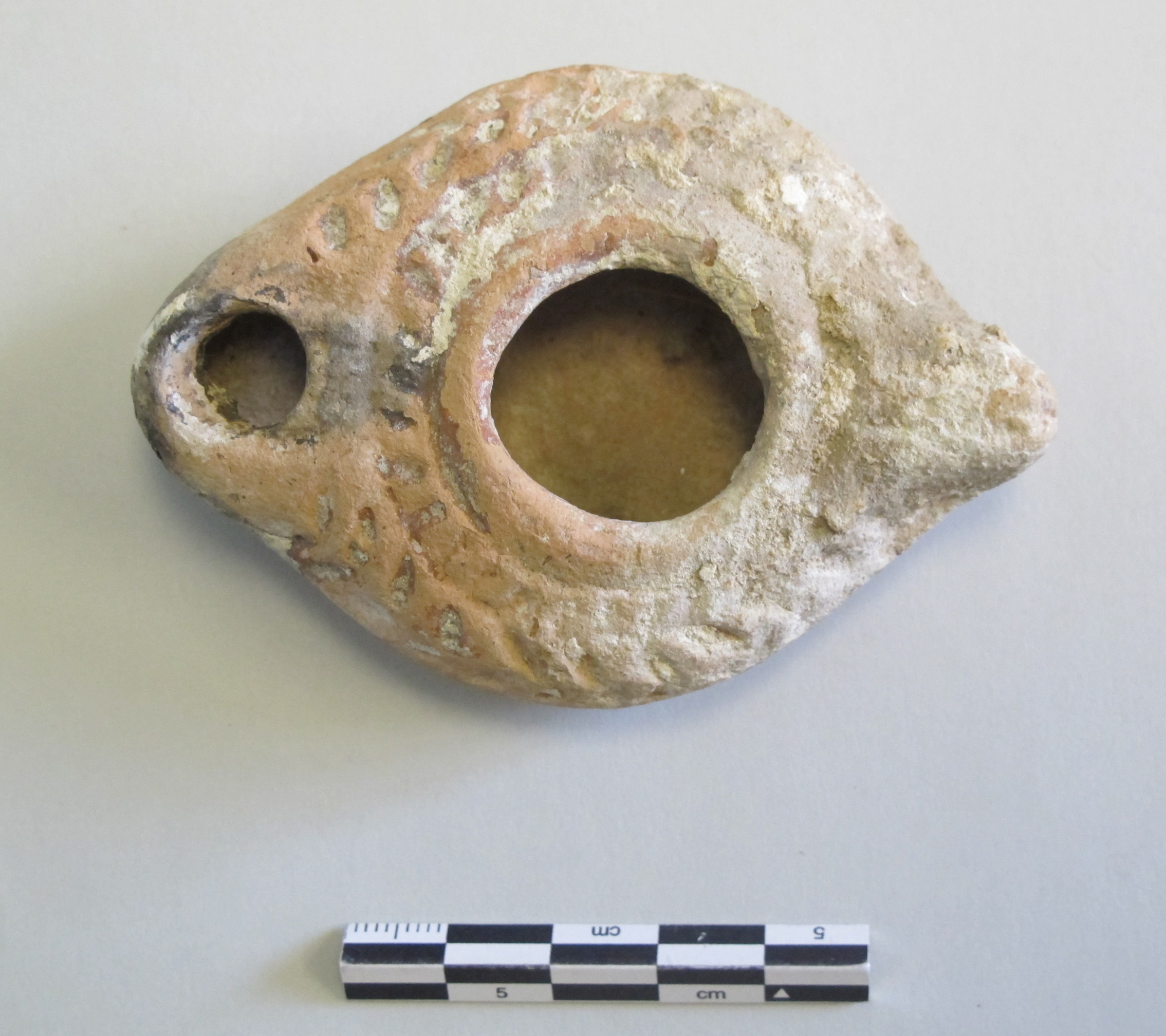 The lamp is made of orange clay, but traces of matte red slip remain in many areas on its surface. There also exist some accretions in the crevices. It is a simple, ovoid shape that is pointed on both ends and bears a larger, open hole in the center. There is a small stub handle protruding off the back. Around the central hole is a ring, followed by a relief decoration.