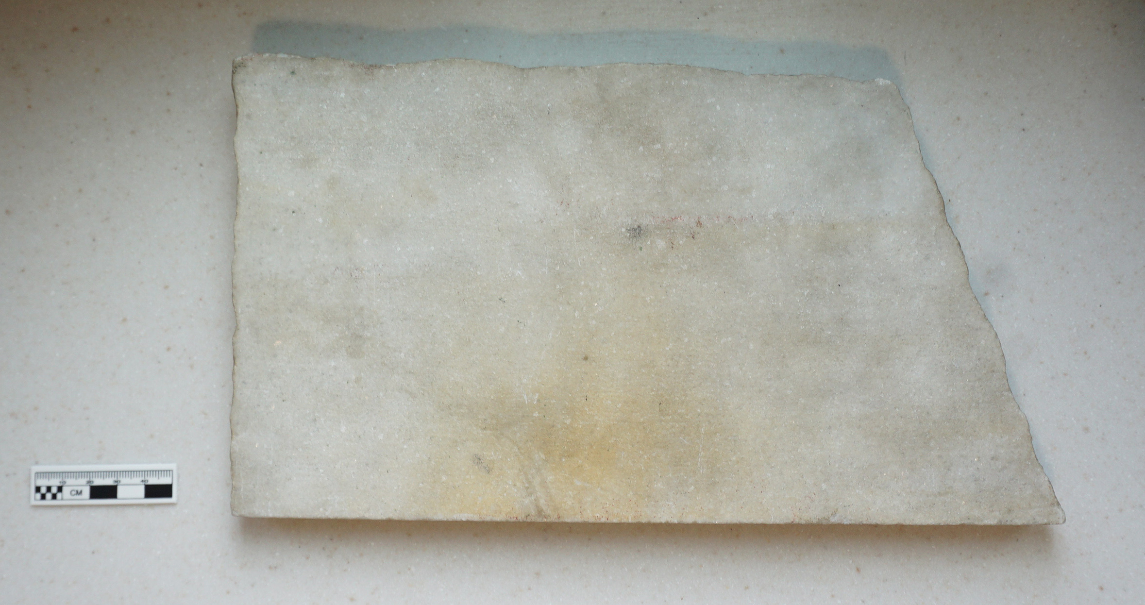Condition: Fair condition, the top and side edges and fragmented while the back and bottom are very smoothly finished; traces of white plaster cover the front surface and the back in some areas