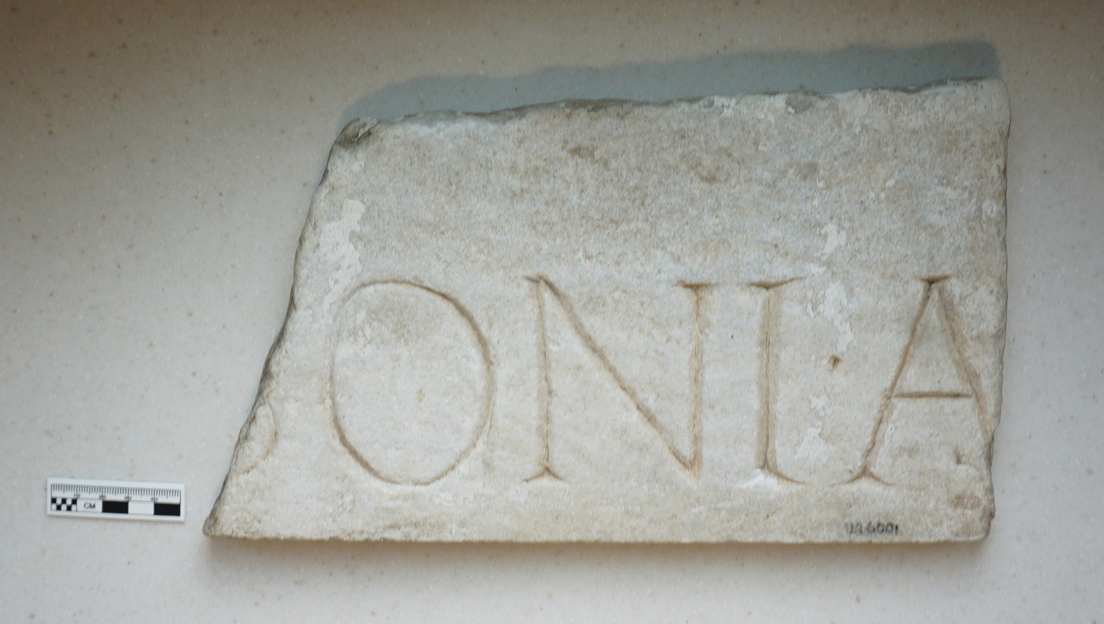 From left to right, the inscription reads “ONI A,” in “square capital” style letters that are evenly spaced. There is a circular mark indicating a word break between the letters “I” and “A.” The letters “N”, “I”, and “A” have notches (serifs) on their ends. On the left side of the inscription is a small portion of a letter preceding the “O”, that could possibly be an “S, B, or G”. The thickness of the letters (particularly the “O”) is somewhat variable.