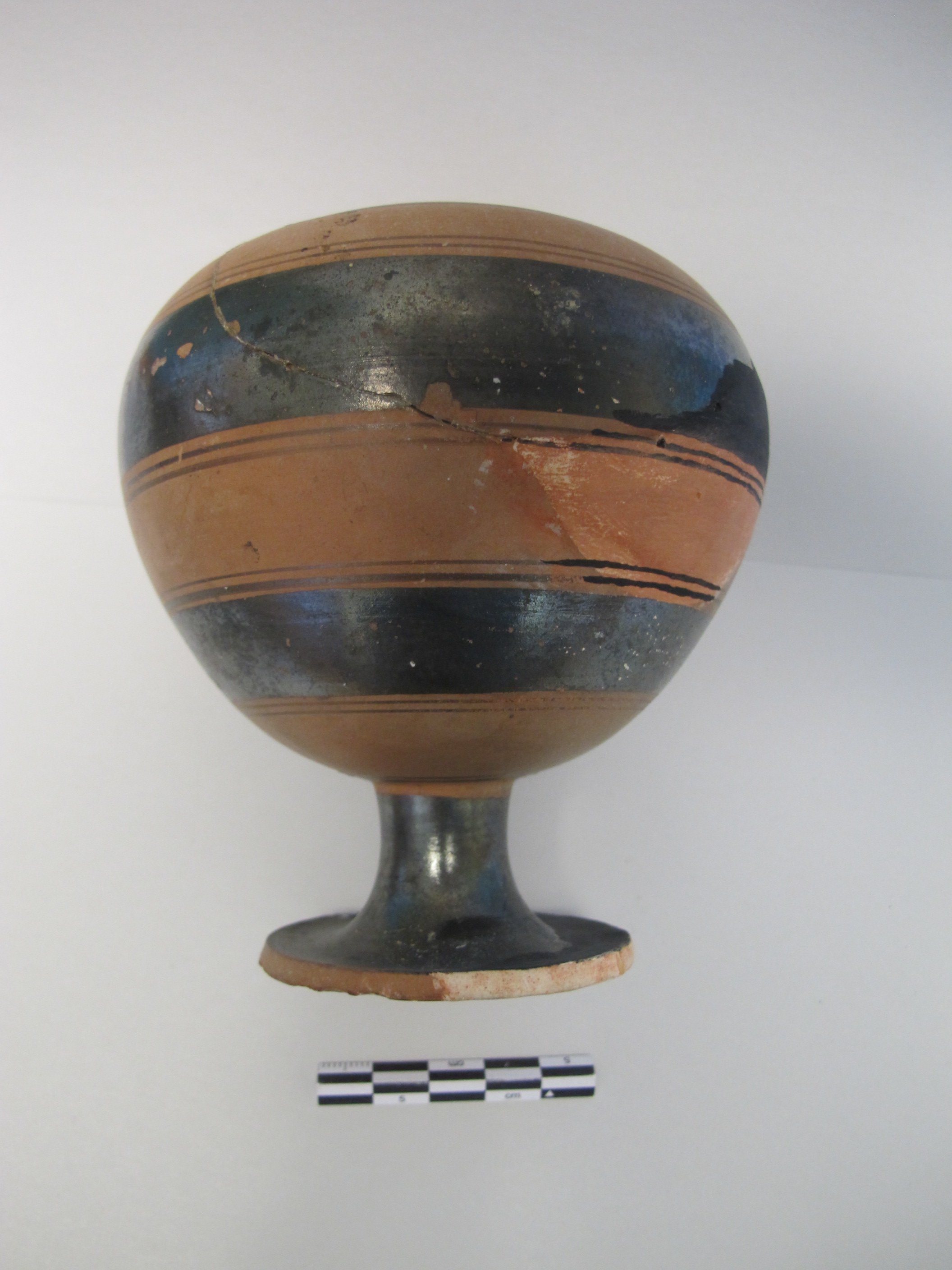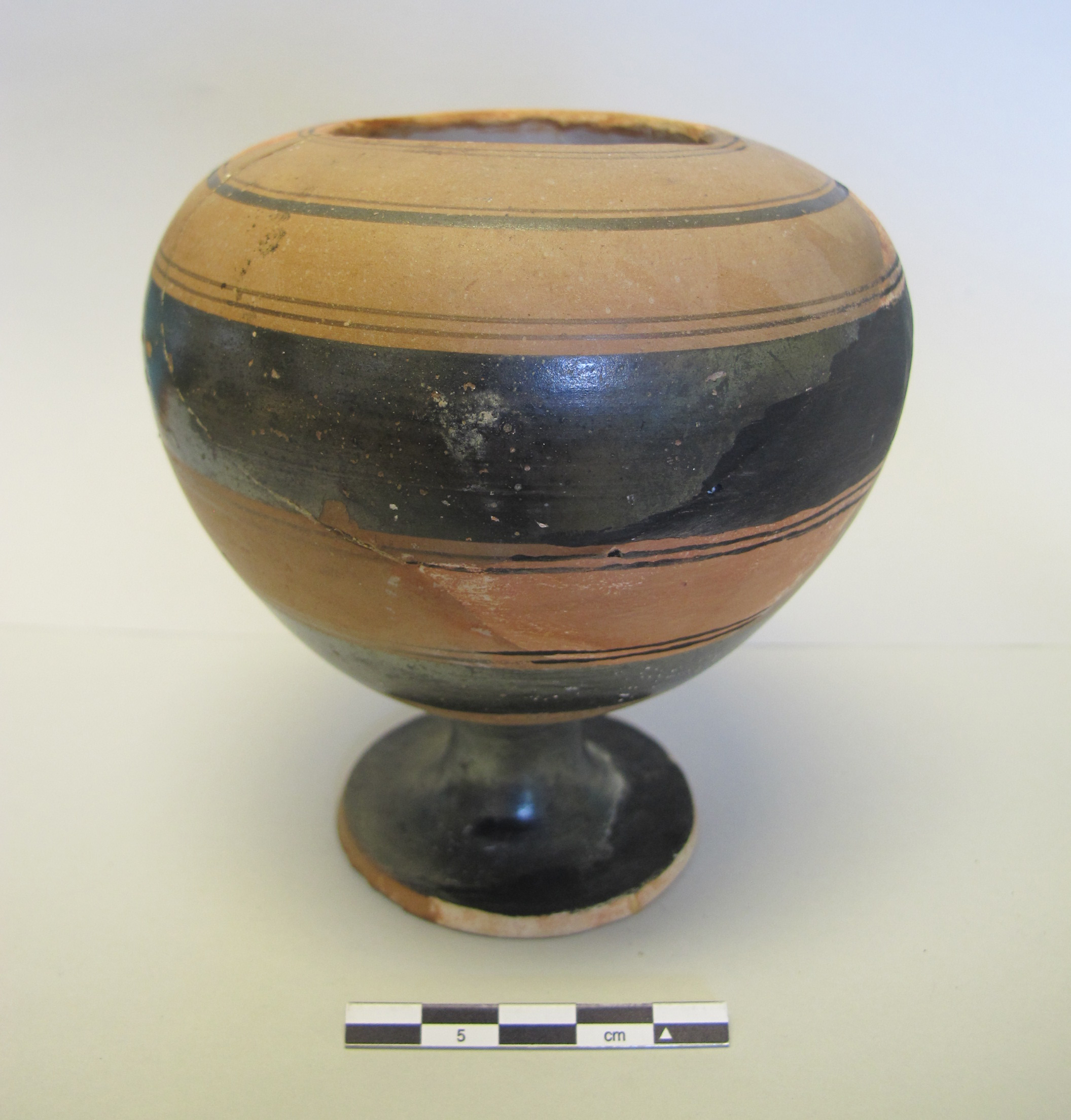 The original clay is fine light brown. The decoration consists of metallic gray-black, glossy horizontal bands: from top to bottom, two thin bands around the neck attachment; then a thin and thick band around the shoulder; then a pair of more thin horizontal bands, then a large band, followed by another pair of horizontal bands; then there is another sequence just like that, only with a thinner central band and without the first thin black line. The base and stem of the piece are both painted metallic black.