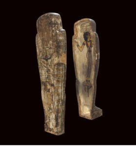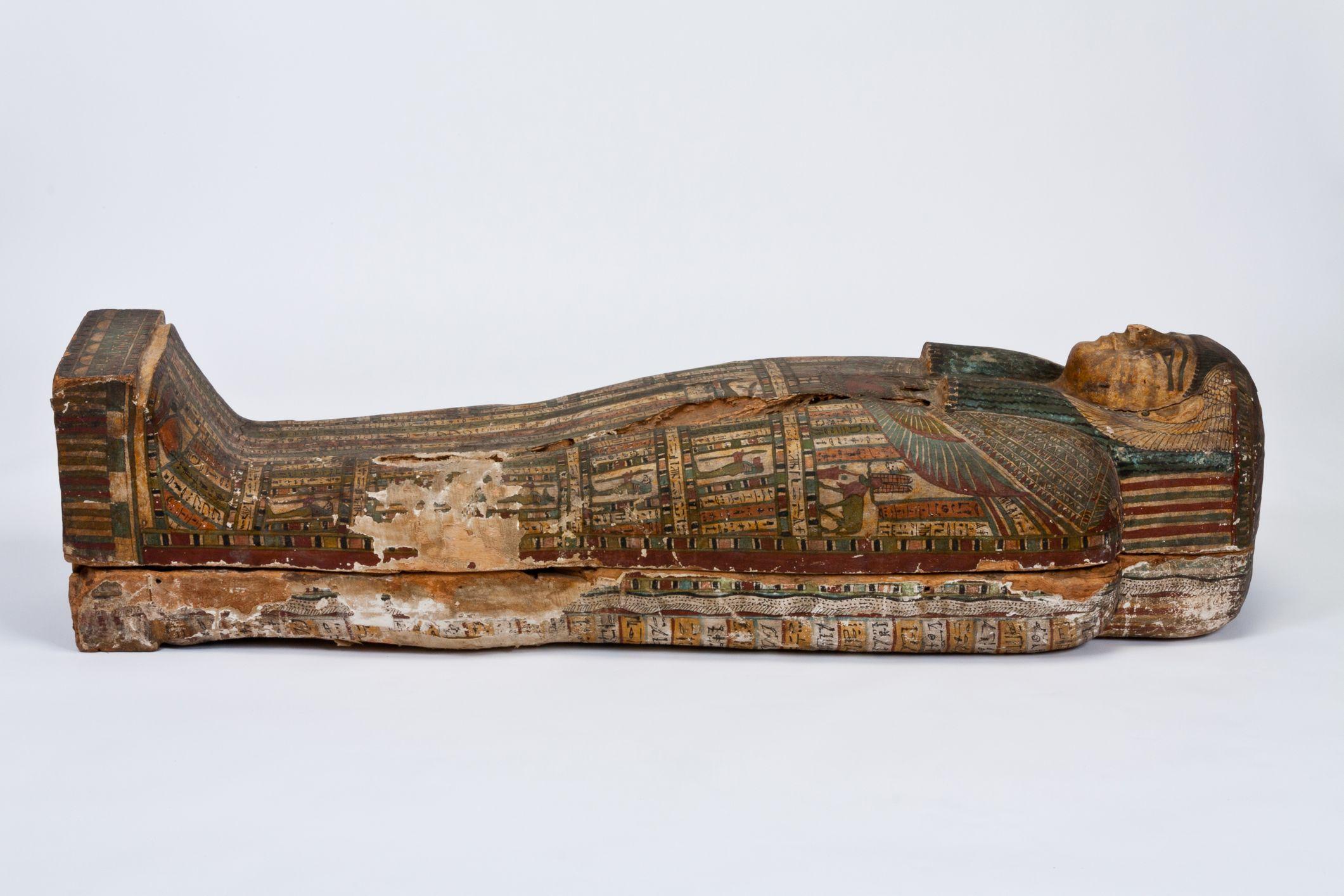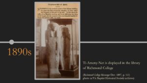 Ti-Ameny-Net lived in ancient Egypt in the 26th Dynasty (ca. 685 – 525 BCE). Her body was dehydrated with natron, preserved in resins, and completely wrapped in linen before being placed in the coffin. She was one of thirty mummies presented to the Prince of Wales during his visit to Thebes in 1869. While the other 29 mummies were taken back to England, Ti-Ameny-Net was given by the prince to his American translator, who sold her to Richmond College professor J.L.M. Curry in 1875. The mummy and coffin were brought to Richmond in 1876, after first being displayed in the US at Thomas Cook & Sons’ pavilion at the Centennial Exposition, Philadelphia. They were displayed in the museum of Richmond College until 1914, when the college moved to the present University of Richmond campus. There was no permanent museum on the new campus, so Ti-Ameny-Net and her coffin were exhibited and stored in various locations including the library and a biology museum in Maryland Hall before finding a home in the Ancient World Gallery, which opened in North Court in 1979 and moved to the Humanities Building in 2021.