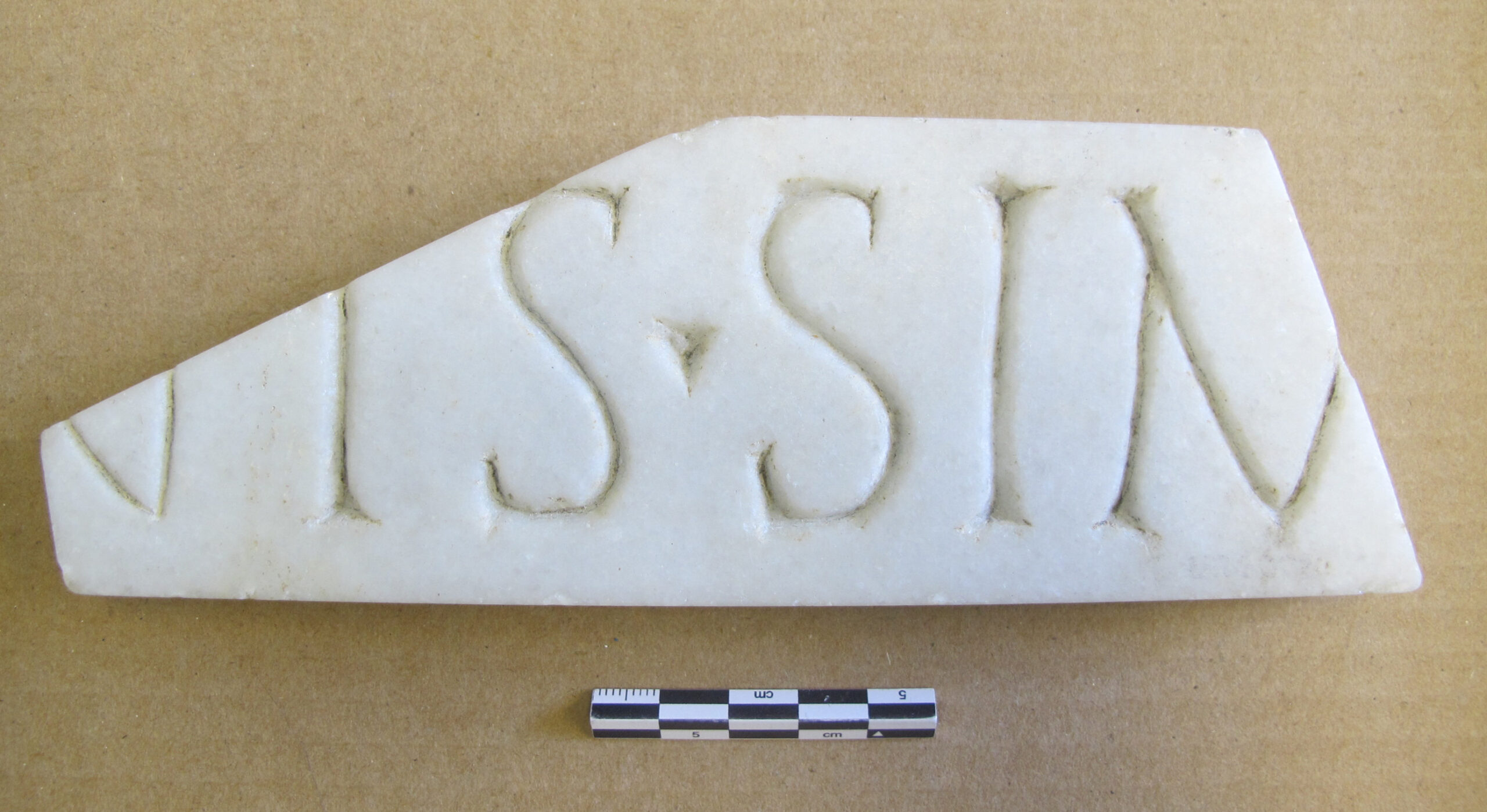 This piece contains several legible letters: NIS - SIM, with a triangular-shaped word break symbol (interpunct) between them. These letters have serifs at the tops and bottoms. The fact that the fragment has been smoothed down on all sides indicates that it was cut for re-use, perhaps as part of an opus sectile pavement. Its original function was most likely funerary, like the example in the Metropolitan Museum of Art noted above. More than 75% of all known Latin inscriptions are funerary.
