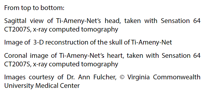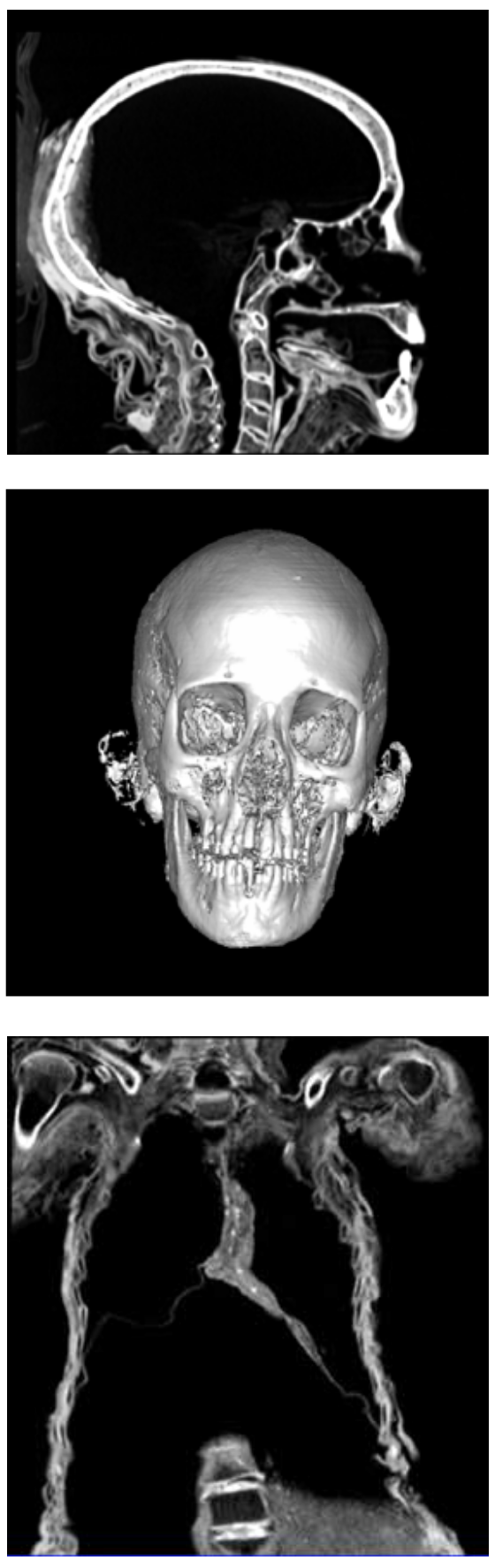 The center image shows a reconstruction of her skull. The cartilage of her ears is also visible.