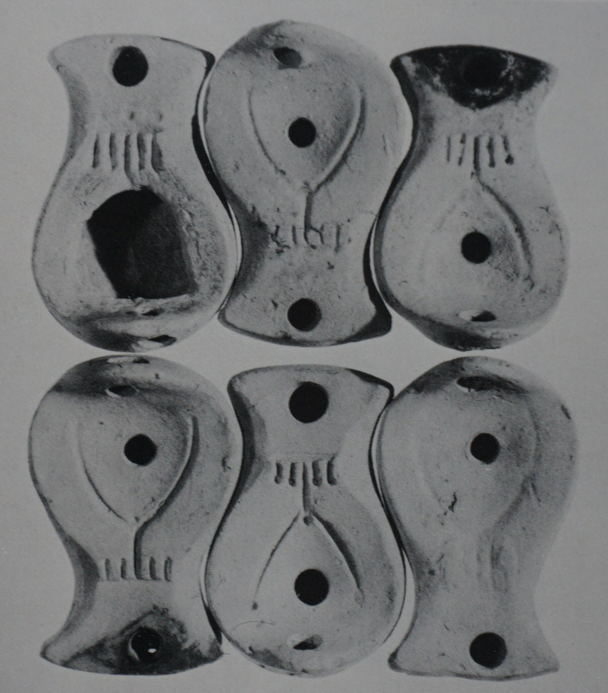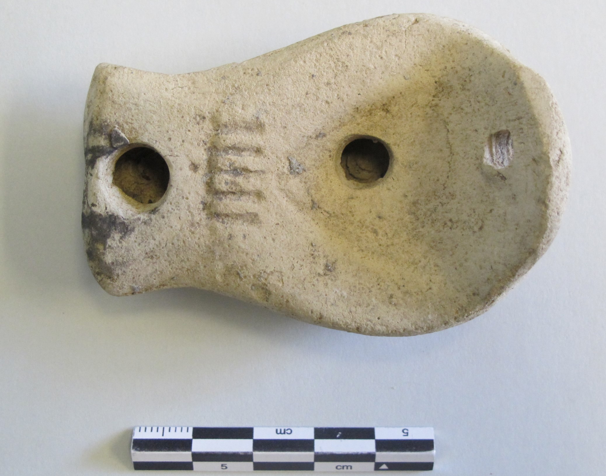 Vogelkopflampen are characterized by a broad nozzle and transverse handle. The German name (which literally means “bird head lamp”) refers to the two birds’ heads with which early forms of these lamps were decorated. While early examples showed clearly-depicted birds, the bird forms were eventually simplified to parallel notches, like the ones seen on this lamp. This lamp is most likely a Late Vogelkopflamp because the birds appear as marks, the handle is transverse and pierced, it has an overall paraboloid shape, and there does not appear to have been any slip applied—all characteristics of the late version.