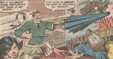 Contrary to the fuming of curmudgeons, many comics taught kids a great deal about vocabulary. This began for me with Marvel’s titles in the “Silver Age” of the late 60s and “Bronze Age” of the early 70s, when a stable of talented young writers penned dialogue under the leadership of the late Stan Lee. Enter a well read super villain, Turner D. Century, whom I recently described as ” a puritanical Luddite. Rides a flying bicycle built for two, has a flamethrower umbrella, and his ‘girlfriend’ is a manakin with a bomb for a head. Primo 70s Marvel.” Though Turner actually dates from the 80s, his vocabulary reaches back to earlier times.