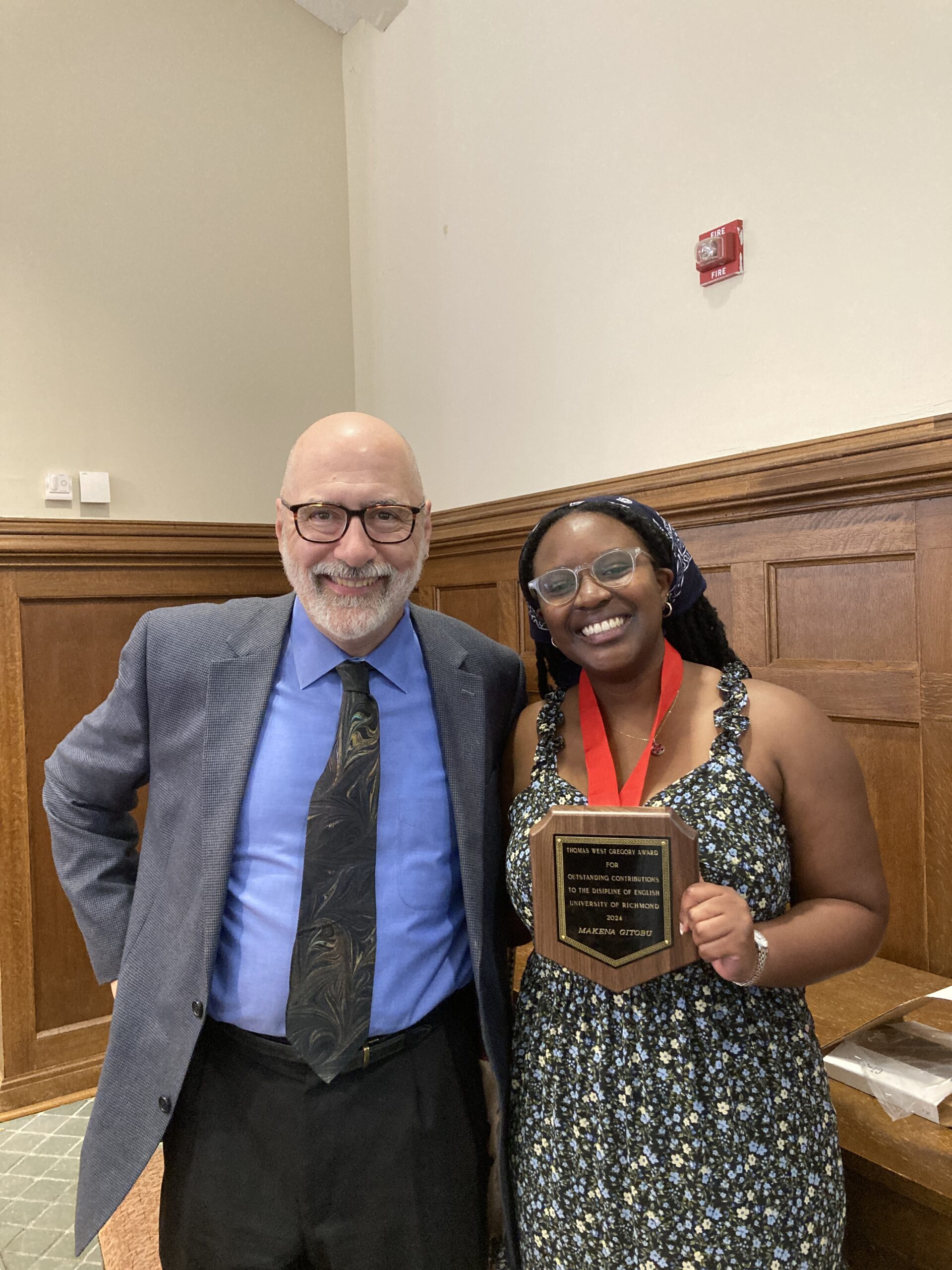 The Thomas West Gregory Award is named for a faculty member who, for many years, advised students seeking certification to teach English and is presented to the senior whom the English faculty judge to be the best English major preparing to teach.